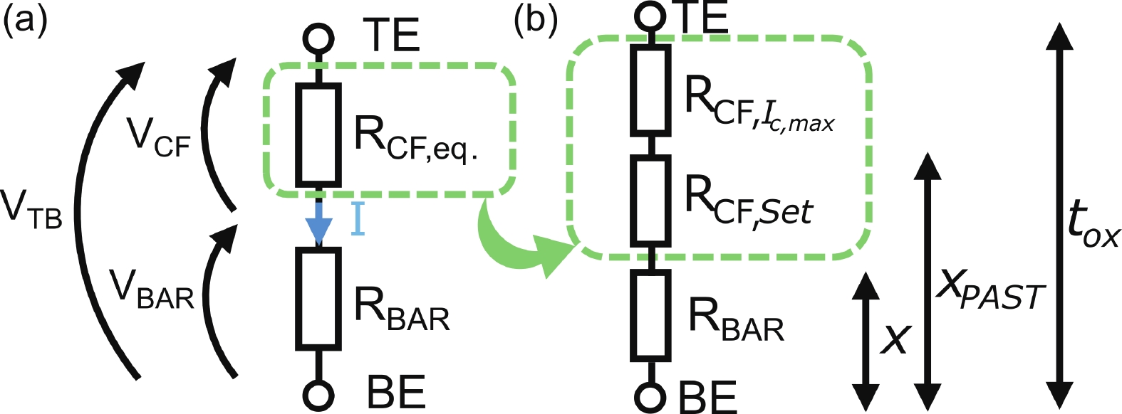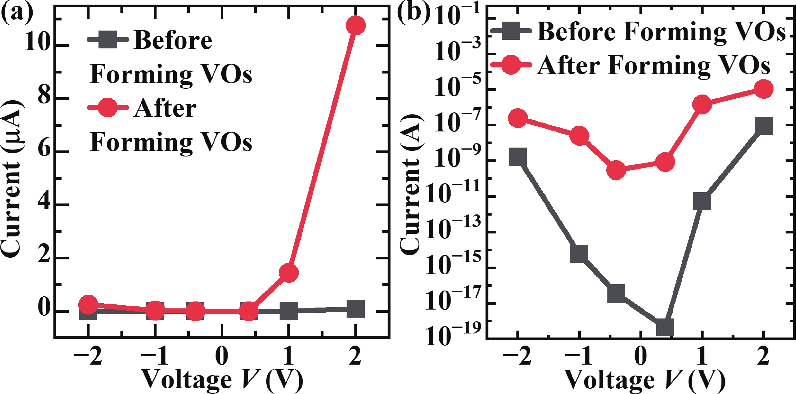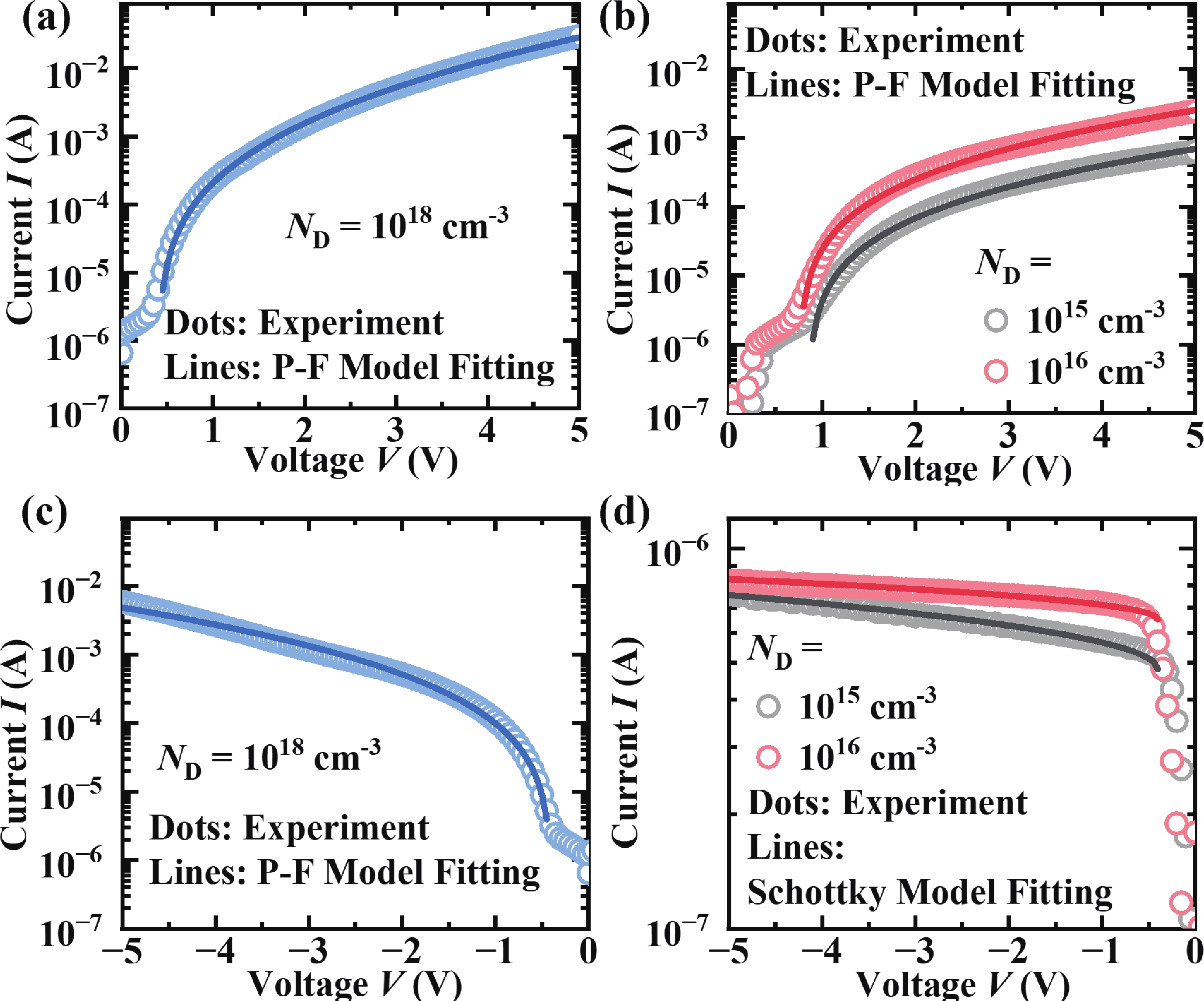 In this work, the oxide-based programmable diodes (PDs) with structure of TiN/HfO2/Si/Al are fabricated, and its electron transport mechanisms are investigated. Electrical measurements results depicted that the conduction and rectification performance of oxide-based PDs are mainly controlled by the interface between oxygen vacancies (VOs) consisted filament and semiconductor electrode. The local density of state in filament and band-bending of the PDs are calculated by first-principal simulation. The electron transport in oxide PDs is dominated by Poole−Frenkel emission under forward bias, while under negative bias, the PDs behave like a reverse Schottky-diode. These mechanisms research is necessary for device optimization and circuit design of oxide-based PDs.