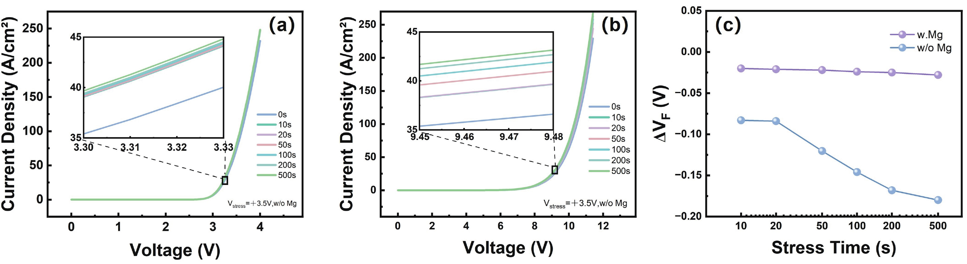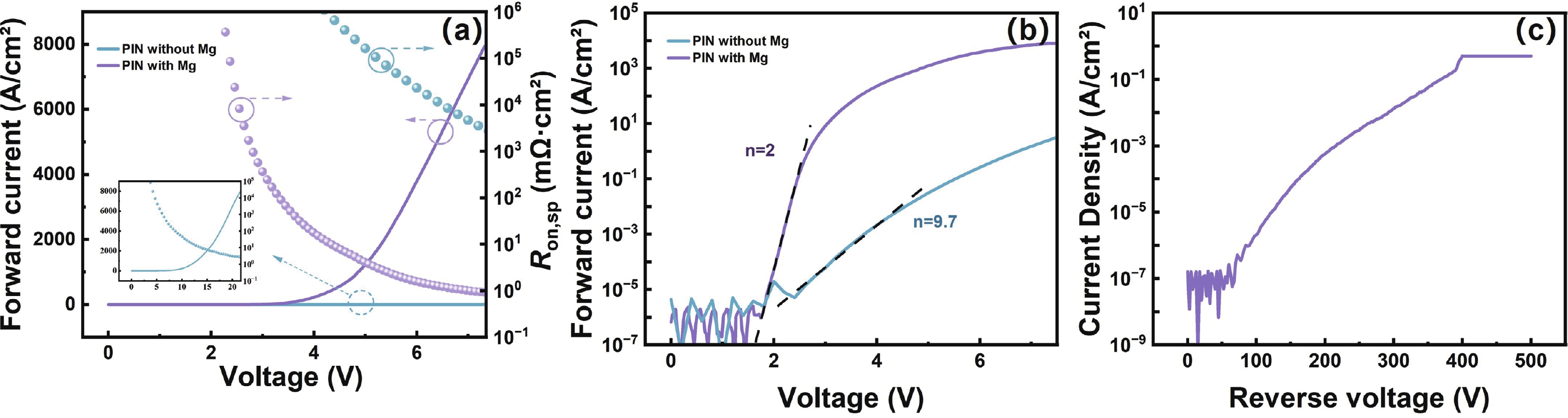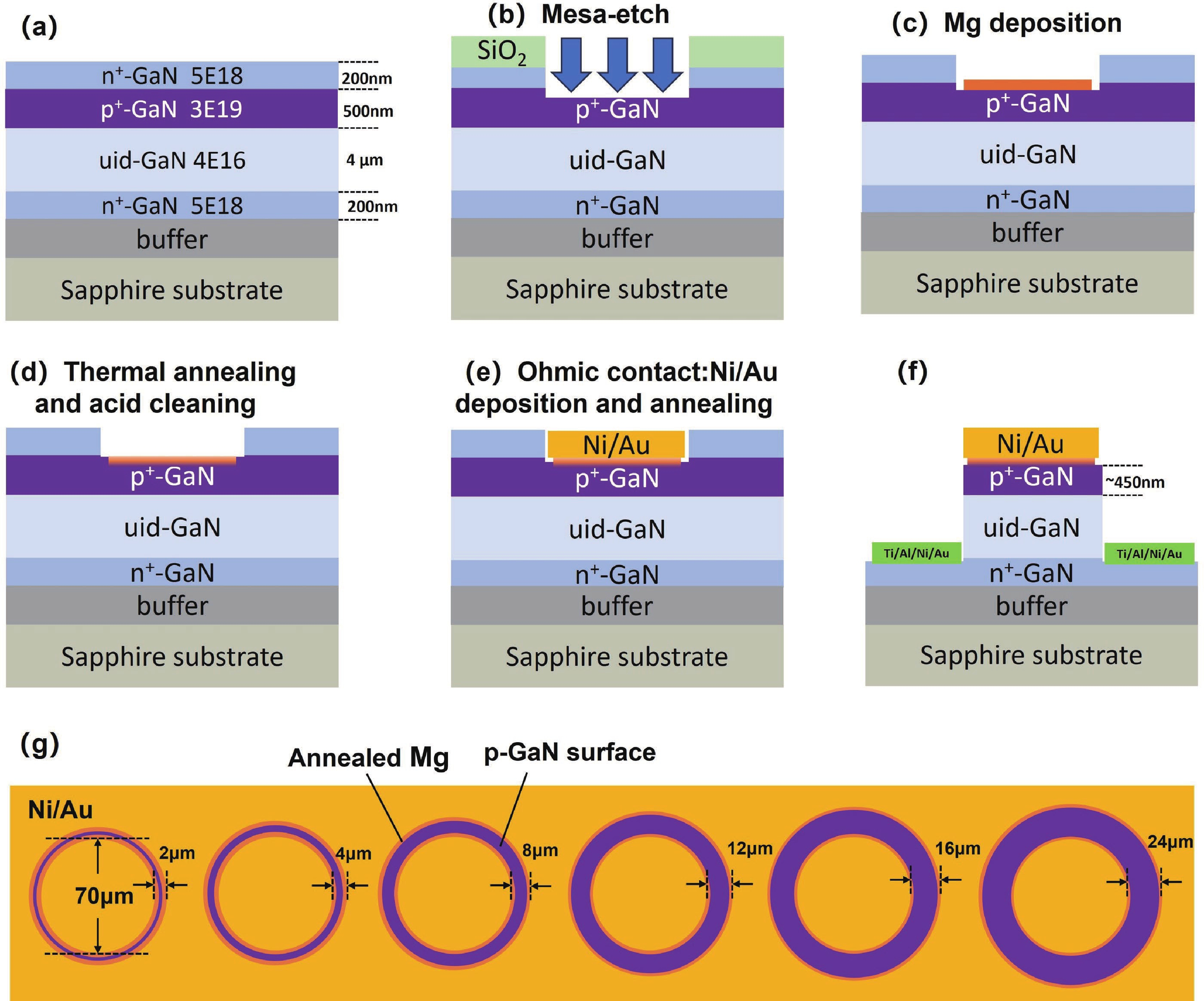 This work demonstrates a high-performance vertical GaN p−i−n diode based on a buried p-layer n-p−i−n epitaxial structure. The post-etch magnesium (Mg) diffusion process is applied to suppress the etch-induced surface damage on the p-GaN layer. The Mg diffusion effectively reduces the valence band barrier from 2 to 1.1 eV, yielding a low specific contact resistivity of 6.521 × 10−4 Ω·cm2. As a result, the fabricated devices exhibit markedly enhanced forward characteristics, including a reduced turn-on voltage of 3.3 V and a specific on-resistance of 0.92 mΩ·cm2. Temperature-dependent forward I−V measurements indicate that the dominant carrier transport mechanism evolves from defect-related tunneling in the etched devices toward transport dominated by intrinsic p–n junction conduction after Mg diffusion. In addition, the devices exhibit excellent stability in forward conduction, with a voltage variation of approximately 0.028 V. These results indicate that Mg diffusion effectively improves the contact characteristics degraded by ICP etching and provide a viable approach for achieving high-performance and reliable vertical GaN power devices.
