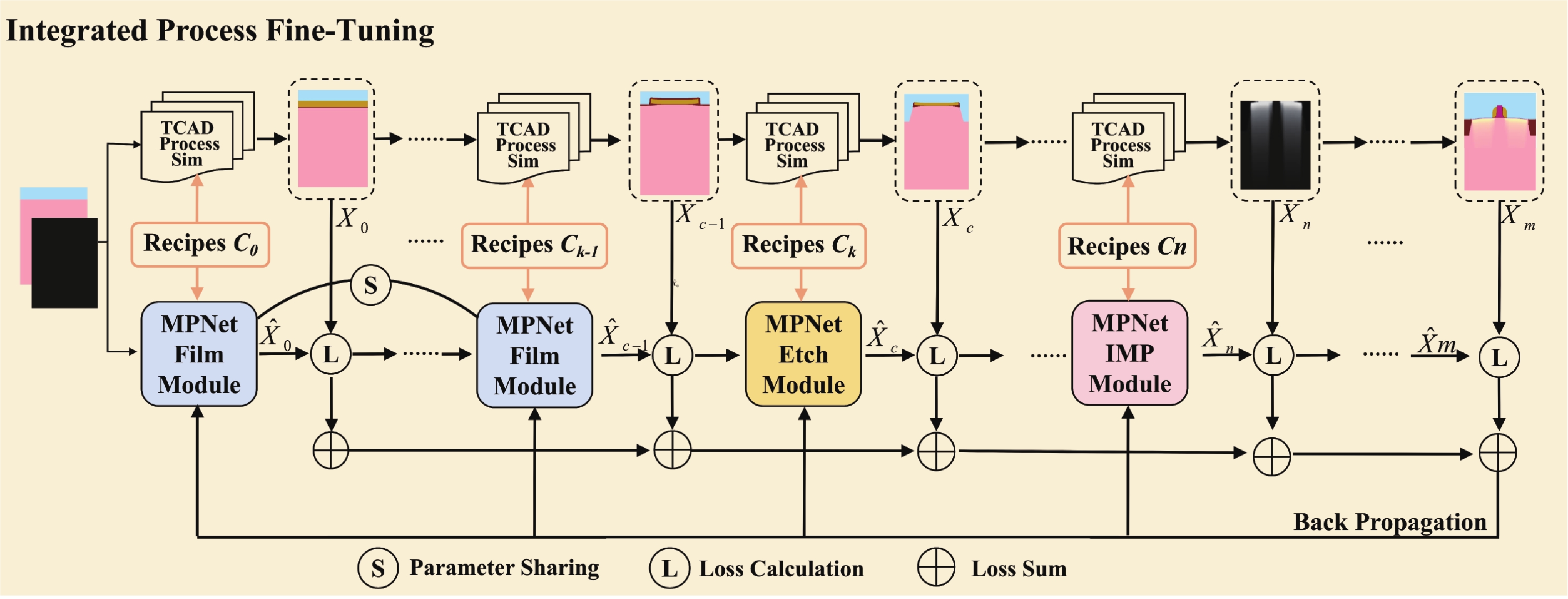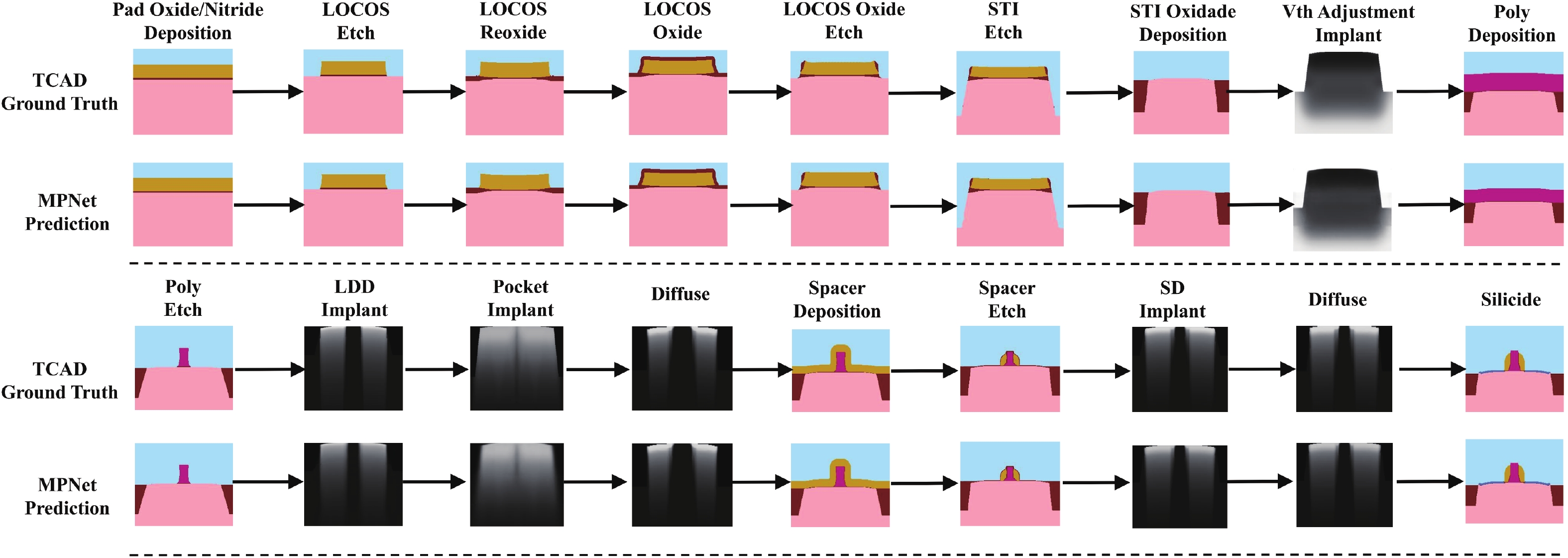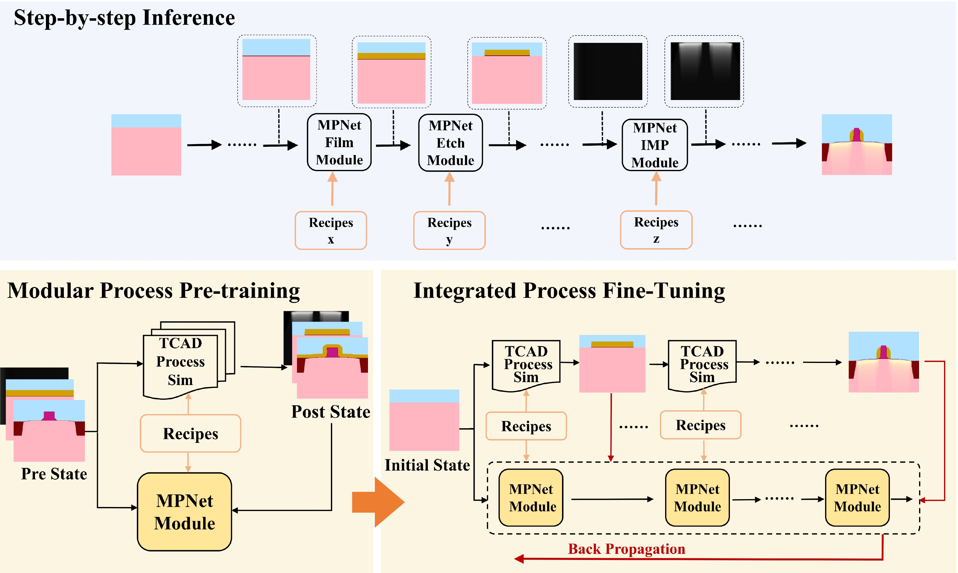 The computational cost of TCAD simulations is becoming prohibitively high with the complexity of advanced process technologies, making simulation acceleration a critical research priority. While end-to-end surrogate models mapping process recipes to device structures and characteristics offer a promising alternative, their application is often limited by poor generalizability and explainability. In this work, we present MPNet, a modular deep learning surrogate modeling framework for process TCAD. MPNet comprises distinct surrogate models for individual process modules, which are assembled into an integrated framework. These modular models employ a novel UNet-attention feature evolution method to capture the complex evolutions of device geometry and doping profiles. Each module can be trained separately on its individual process, after which the modules are cascaded and jointly fine-tuned to minimize error accumulation throughout the cascade. The efficacy of the proposed MPNet framework is demonstrated through a MOSFET integrated process TCAD case study. Results show that MPNet achieves a computational speedup of over 103 times compared to conventional TCAD, while maintaining predictive fidelity exceeding 98%. Finally, to illustrated the application of the proposed framework, MPNet is coupled with a PSO algorithm, showcasing its utility for fast process optimization to meet specific process targets.