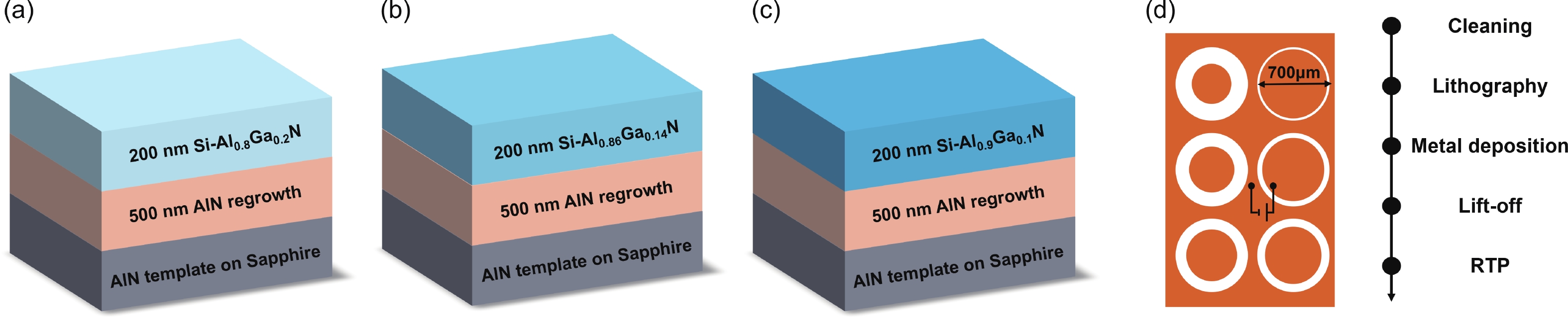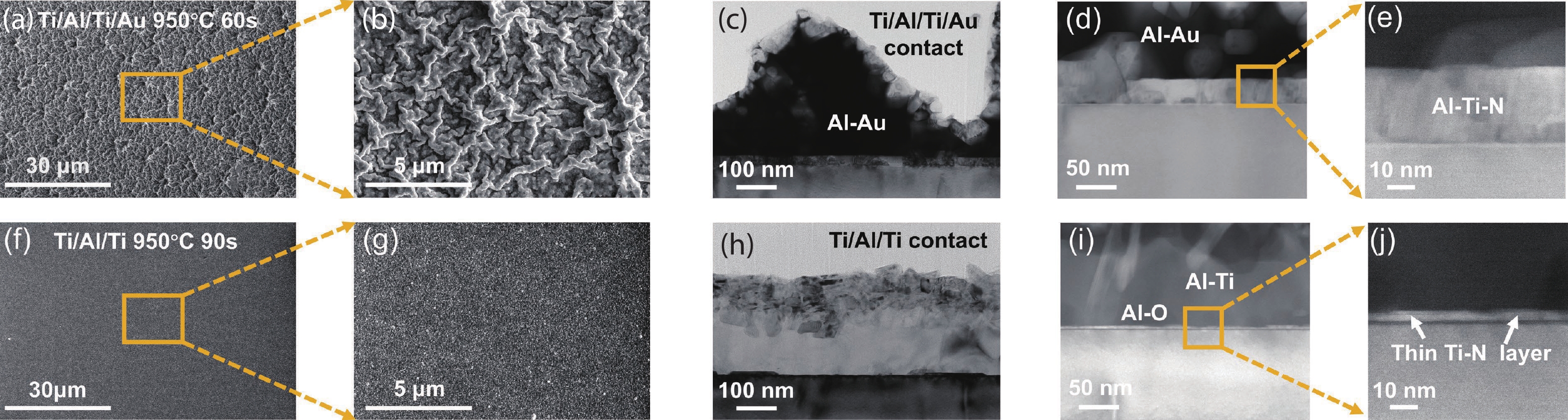 Al-rich AlxGa1−xN (x ≥ 0.8) is promising for power and deep-ultraviolet (DUV) optoelectronic applications, owing to its ultra-wide bandgap and excellent thermal stability. However, forming low-resistivity contacts on n-type Al-rich AlGaN remains a significant challenge. In this work, we utilized an Au-free Ti/Al/Ti metal stack contact on n-type Al-rich AlGaN without graded layers. Record-low contact resistivities were achieved after annealing: 1.52 × 10−6 Ω·cm2 for n-Al0.8Ga0.2N, 3.56 × 10−6 Ω·cm2 for n-Al0.86Ga0.14N, and 5.79 × 10−5 Ω·cm2 for n-Al0.9Ga0.1N. These results demonstrate a significant advancement in forming low-resistance contacts directly on Al-rich n-AlGaN, offering a viable path forward for next-generation power electronics and DUV optoelectronic devices.