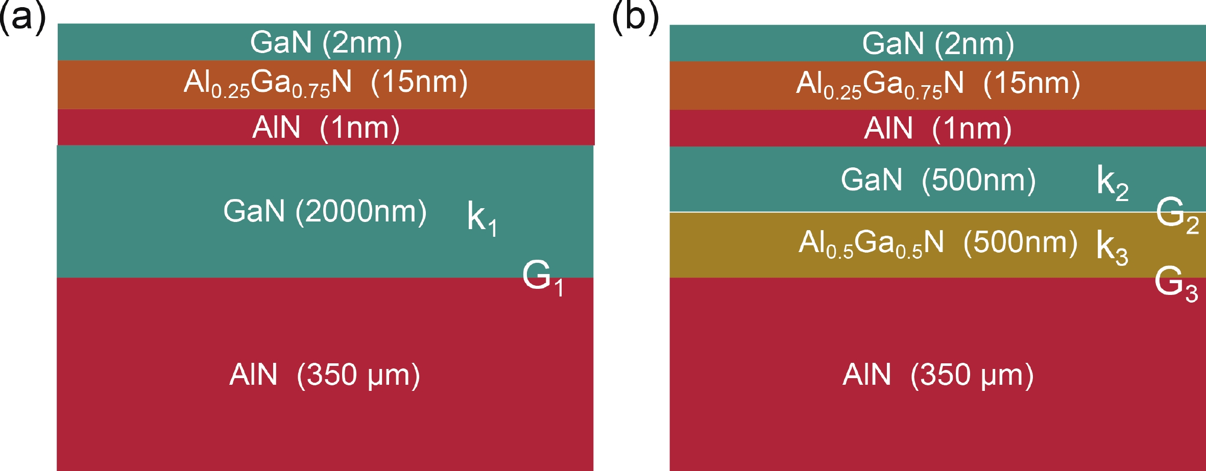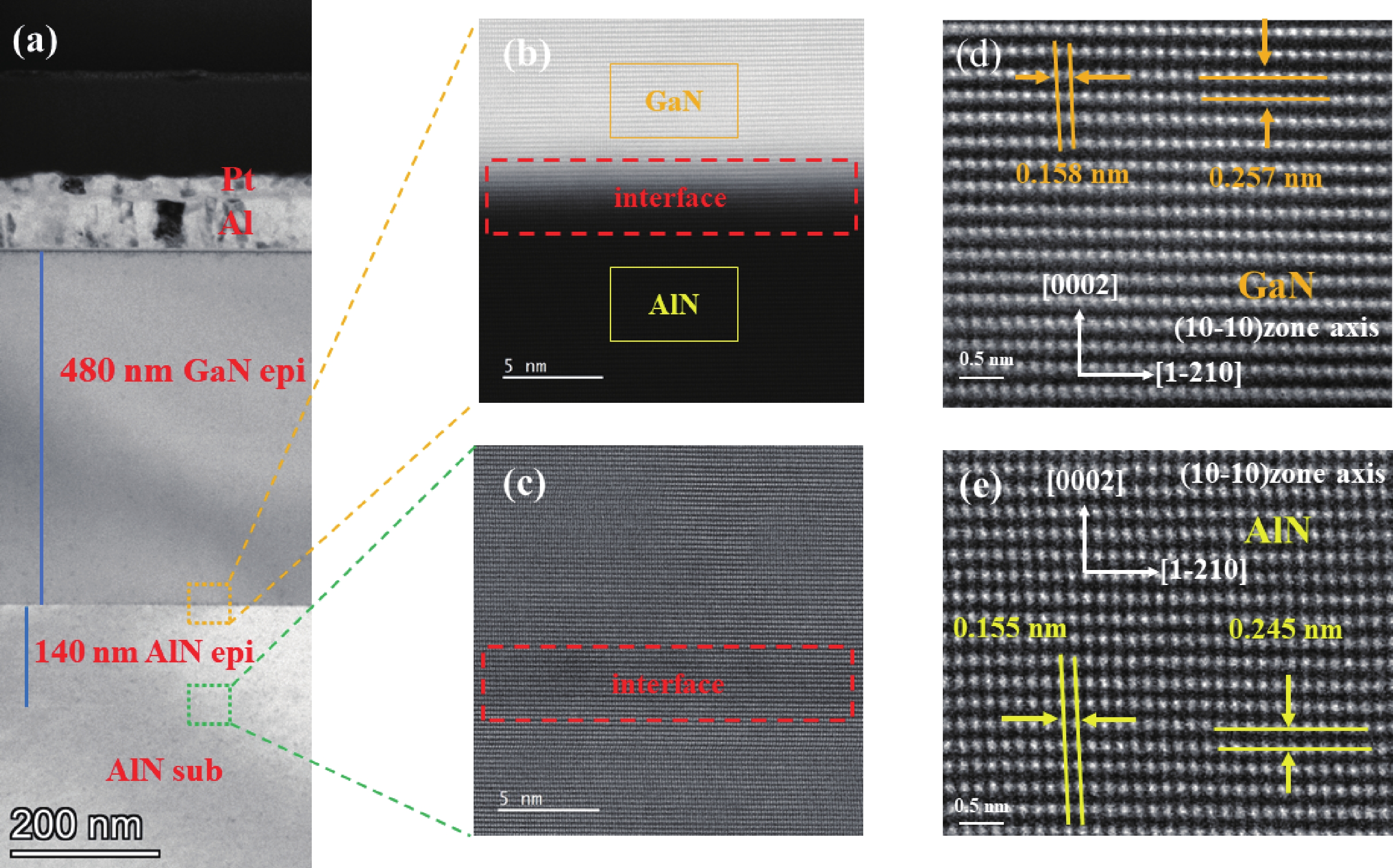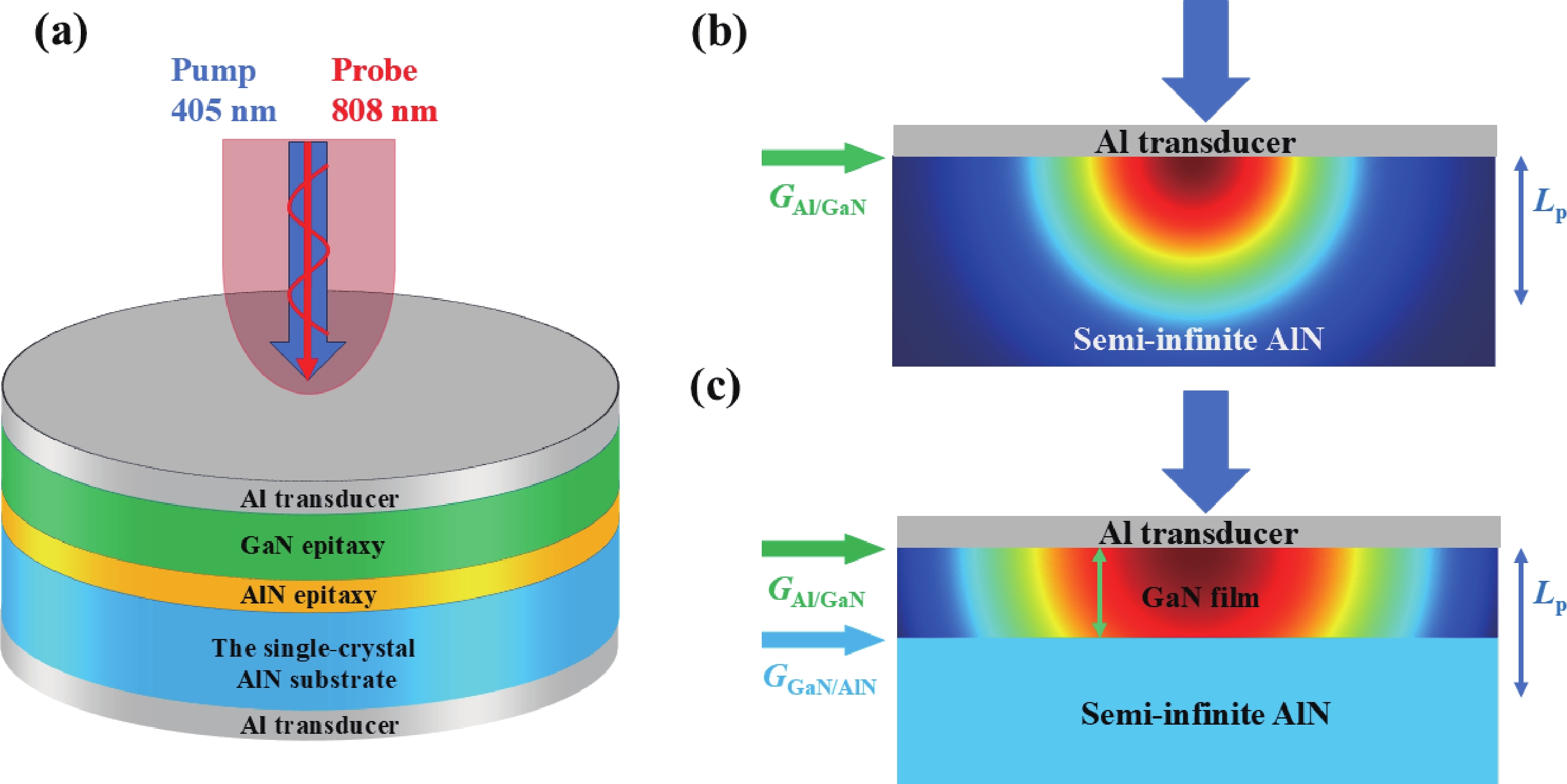 Bulk single-crystal aluminum nitride (BSC AlN) substrates are known to be ideal platforms for constructing high-power and DUV optoelectronic nitride devices. However, high-quality epitaxial growth of nitride films on BSC AlN and related characterization is still far from being well studied. The challenges and uncertainties in doing accurate thermal characterization on such heterostructures are not fully recognized. In this study, we successfully fabricated a buffer-free thin GaN/AlN heterostructure on a BSC AlN substrate via metal−organic chemical vapor deposition (MOCVD) technology. This heterostructure consists of a 140 nm-thick AlN homoepitaxial layer and a 480 nm-thick GaN epitaxial layer. Characterization results indicate that the prepared heterojunction has excellent crystal quality and smooth surface morphology. To accurately obtain the thermophysical parameters of the heterostructure, this study employed broadband frequency domain thermoreflectance (BB-FDTR) technology, and careful measurements with detailed data analysis were demonstrated. In addition to showing the feasibility of epitaxial growth of high-quality thin film GaN directly on BSC AlN substrates, this study also provides key experimental data for evaluating the heat dissipation advantages of GaN/AlN heterostructures.
