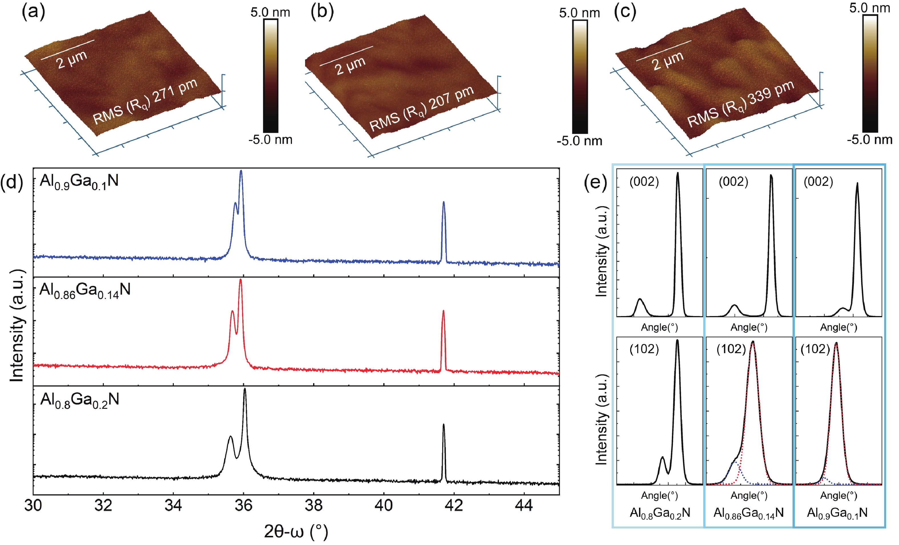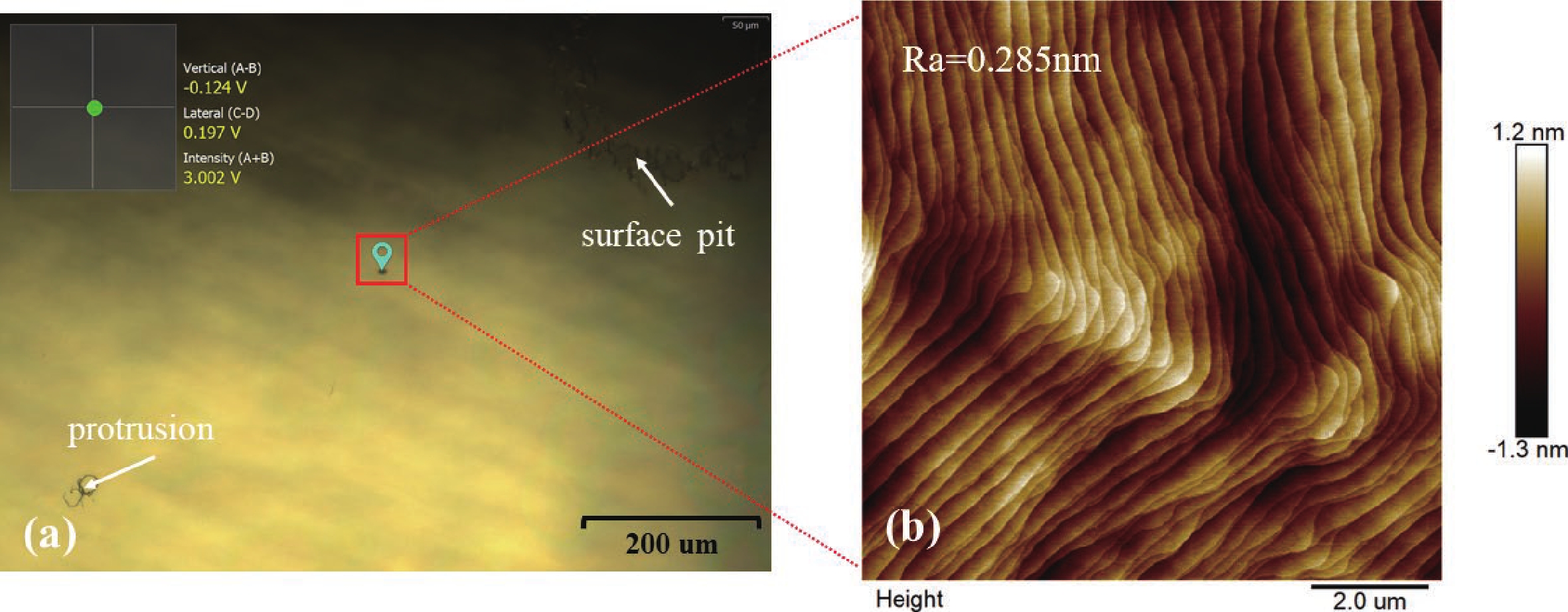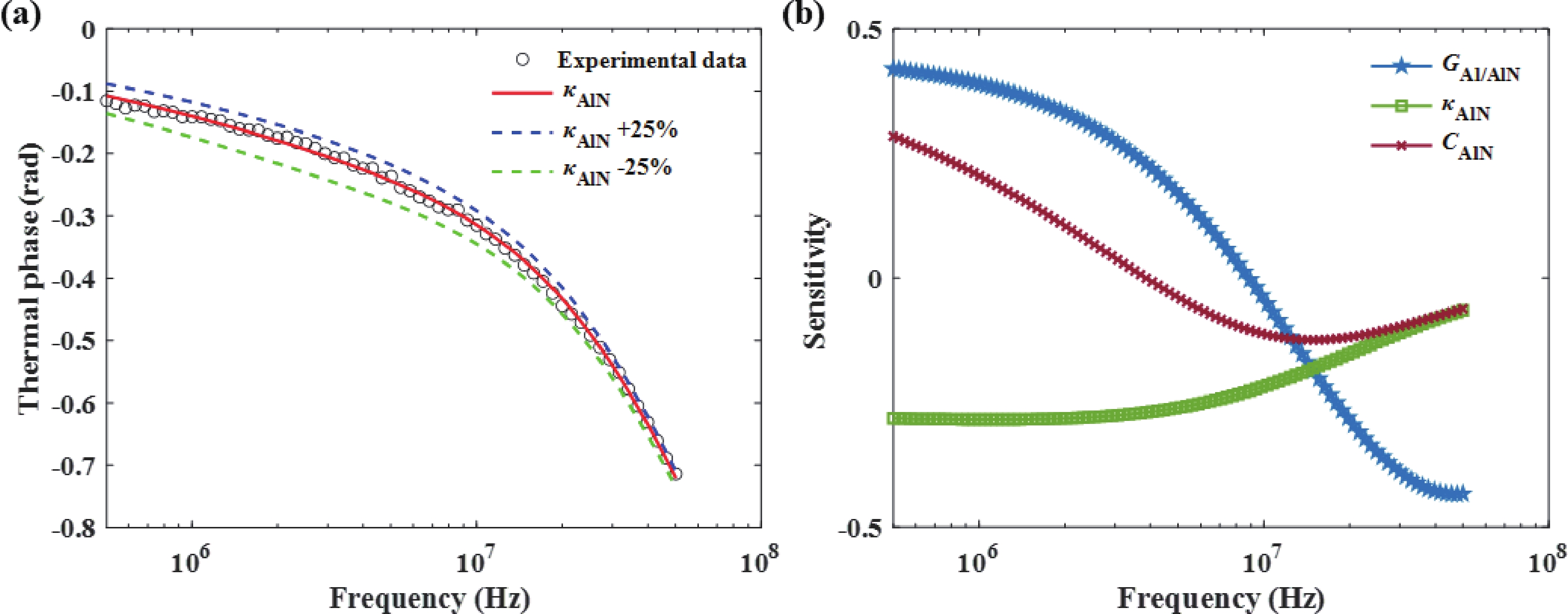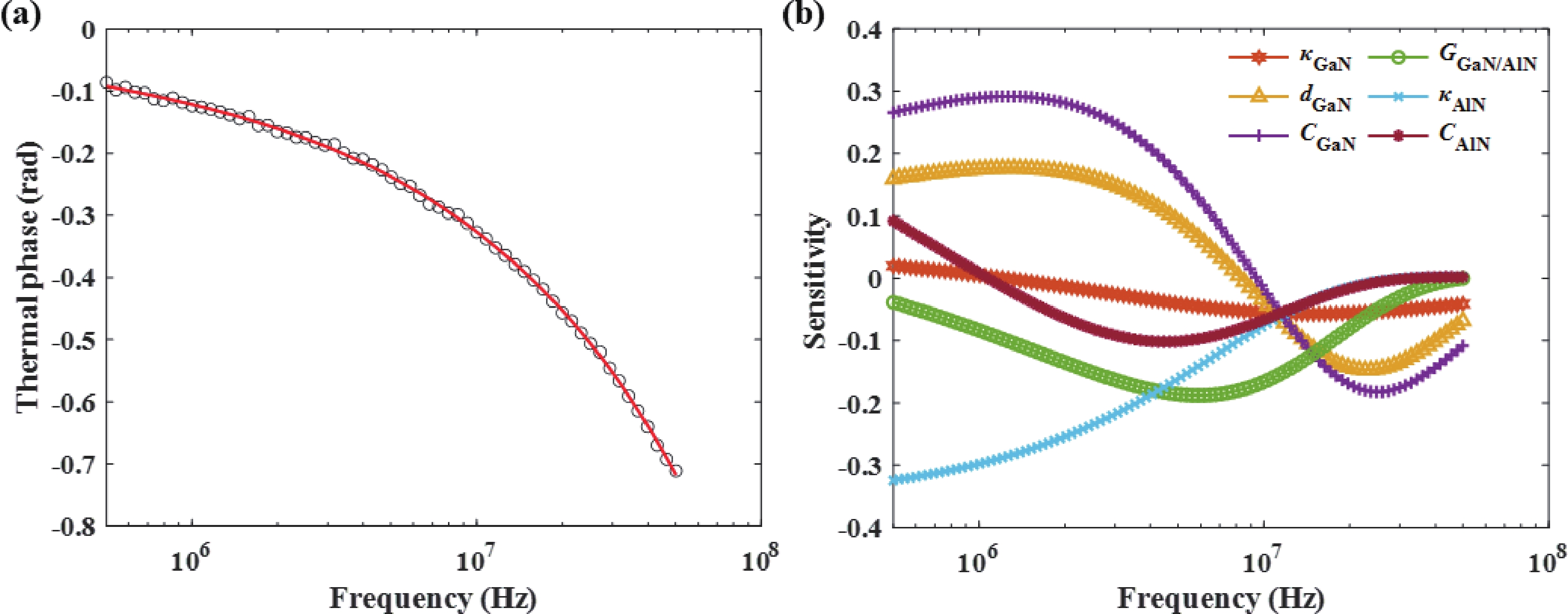 Bulk single-crystal aluminum nitride (BSC AlN) substrates are known to be ideal platforms for constructing high-power and DUV optoelectronic nitride devices. However, high-quality epitaxial growth of nitride films on BSC AlN and related characterization is still far from being well studied. The challenges and uncertainties in doing accurate thermal characterization on such heterostructures are not fully recognized. In this study, we successfully fabricated a buffer-free thin GaN/AlN heterostructure on a BSC AlN substrate via metal−organic chemical vapor deposition (MOCVD) technology. This heterostructure consists of a 140 nm-thick AlN homoepitaxial layer and a 480 nm-thick GaN epitaxial layer. Characterization results indicate that the prepared heterojunction has excellent crystal quality and smooth surface morphology. To accurately obtain the thermophysical parameters of the heterostructure, this study employed broadband frequency domain thermoreflectance (BB-FDTR) technology, and careful measurements with detailed data analysis were demonstrated. In addition to showing the feasibility of epitaxial growth of high-quality thin film GaN directly on BSC AlN substrates, this study also provides key experimental data for evaluating the heat dissipation advantages of GaN/AlN heterostructures.