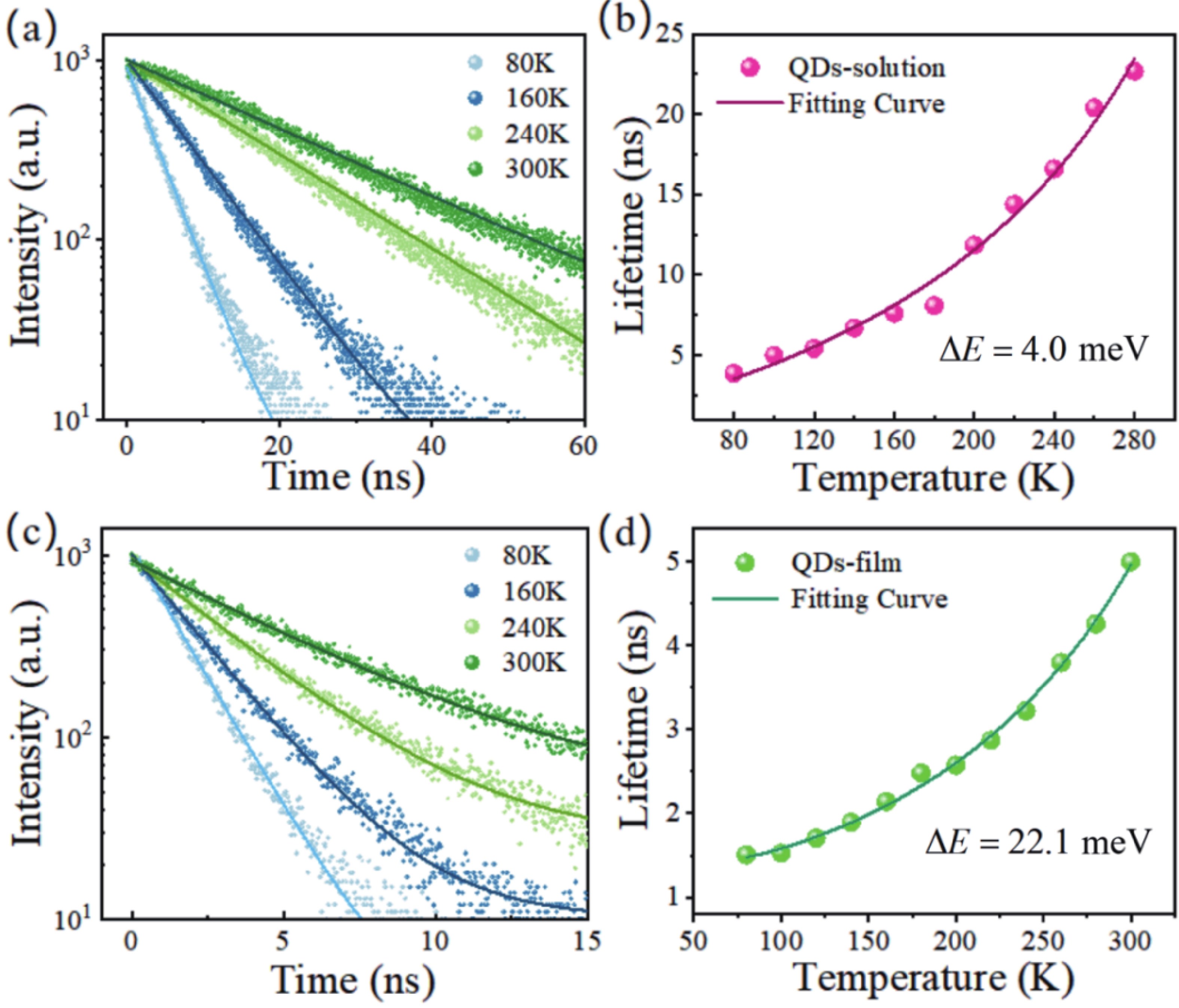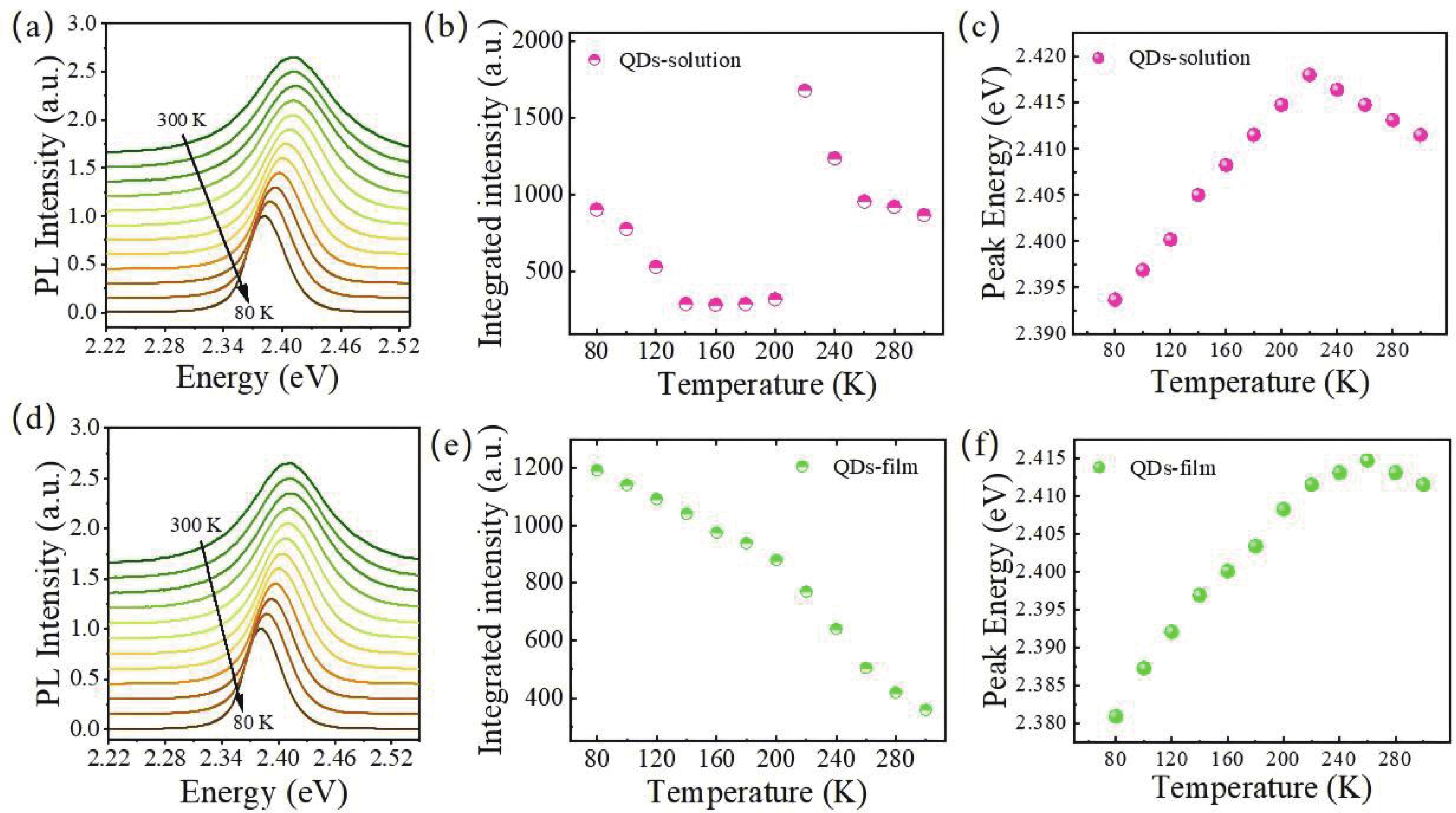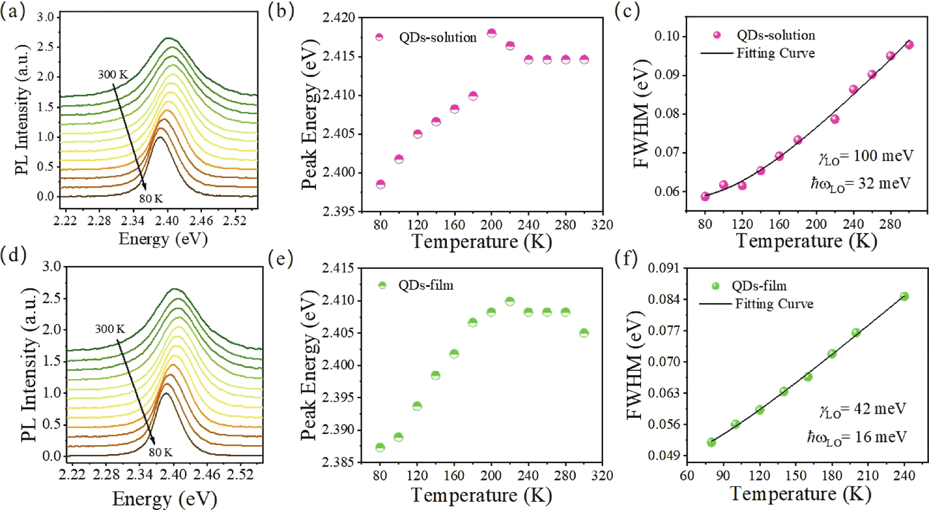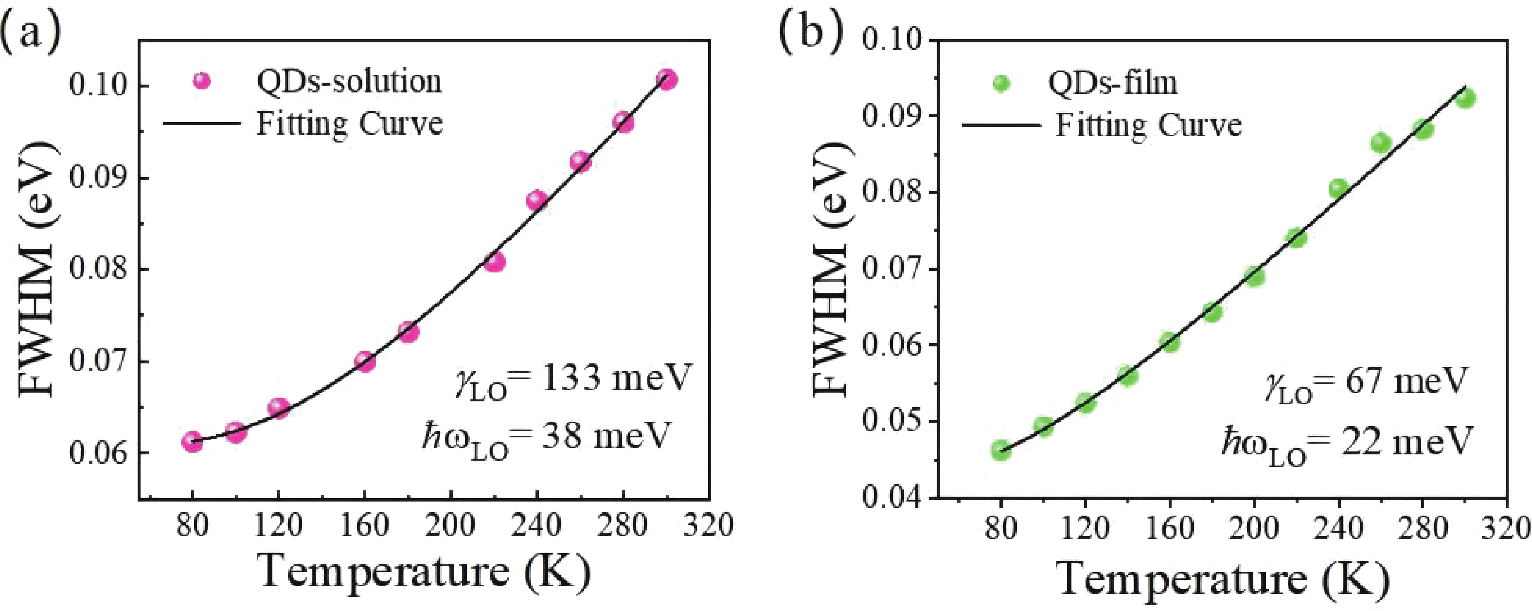 Temperature dependent photoluminescence (PL) and time-resolved PL (TRPL) of CsPbBr3 quantum dots (QDs) in solution and film are investigated. The electron−phonon coupling strength of quantum dots in solution is found two times larger than that of thin films. The averaged phonon energy involved in luminescence is also significantly higher than that of thin films, indicating that ligands’ phonons are involved in optical processes in solution but not in film. TRPL shows that the luminescence lifetime of the solution (22.5 ns) is longer than that of the thin film (5 ns) at room temperature, and both decrease abnormally with decreasing temperature, ascribing to the thermally activated trap states for PL, the further analysis shows that the trap energy levels in the thin film are deeper (~20 meV) compared to ~4 meV in solution. Our work proves that the morphology of organic ligands can regulate electron−phonon interactions and optoelectronic properties in CsPbBr3 QDs, providing fundamental insights into its photophysics.