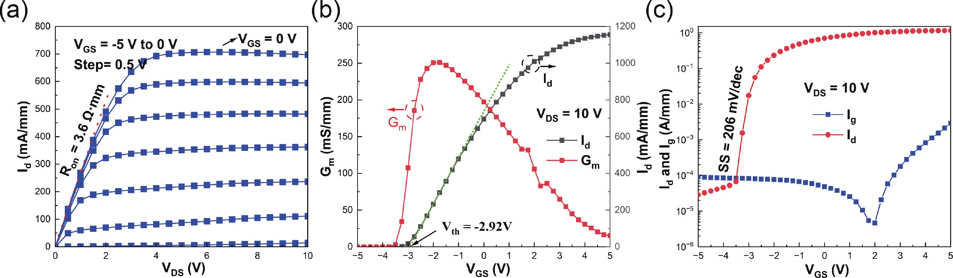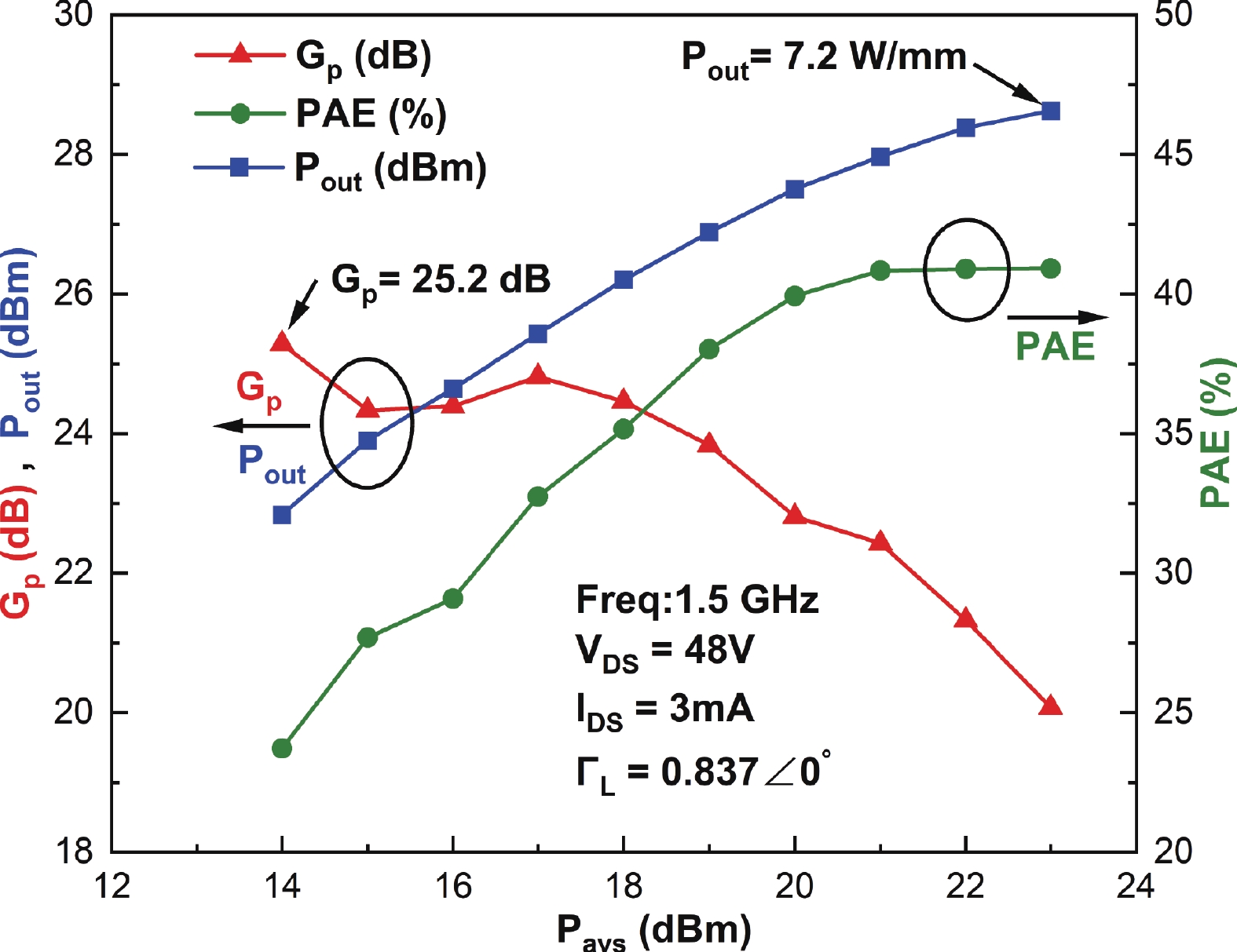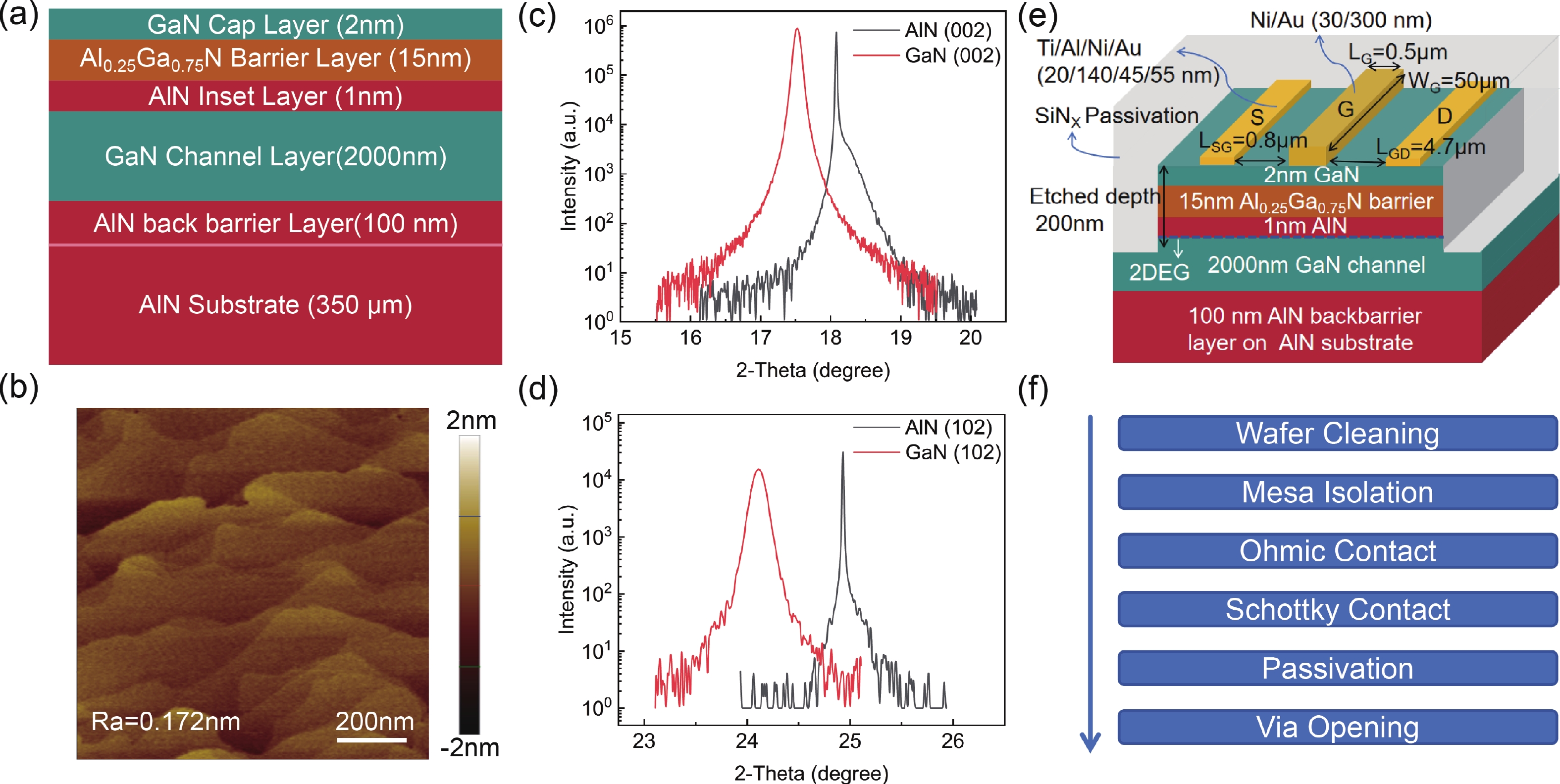 In this letter we report the morphological, electrical and thermal transport properties of a high electron mobility transistor (HEMT) style epitaxial wafer, where an approximately 2000 nm thick GaN layer has been directly deposited on a bulk single crystal AlN (BCS AlN) substrate with no buffer layer in between, and also the experimental results of DC and RF properties of a HEMT device based on such a wafer. The sample achieved very smooth surface morphology and roughness down to Ra = 0.172 nm over an area of 1 μm × 1 μm in AFM measurements. Electrical transport measurements showed sheet carrier concentration of 7.3 × 1012 cm−2, Hall mobility of 2220 cm2/(V·s) and sheet resistance of 386 Ω/sq. The measured maximum trans-conductance Gm of the fabricated HEMT device was 250 mS/mm at a gate bias voltage of −1.8 V. With a gate length of 500 nm and a gate-to-drain distance of 4.7 μm, the fT and fmax, derived from S-parameters measurements, are 25.9 and 54 GHz, respectively. Large-signal RF measurement exhibited a high linear power gain (Gp) of 25.2 dB and a peak output power (Pout) density of 7.2 W/mm@1.5 GHz, associated with a power-added efficiency (PAE) of 40.9%. Comparing with the structure with a 500 nm thick AlGaN buffer, the total thermal resistance of the structure in our device decreased by 44%. This work confirms the technical feasibility of fabricating GaN HEMT devices on BCS AlN substrates without any additional buffer layer, and the excellent electric and thermal transport properties of the simplified wafer structure indicate a bright future of BCS AlN-based GaN HEMT devices in ultra-high-frequency and high-power-density nitride electronics.