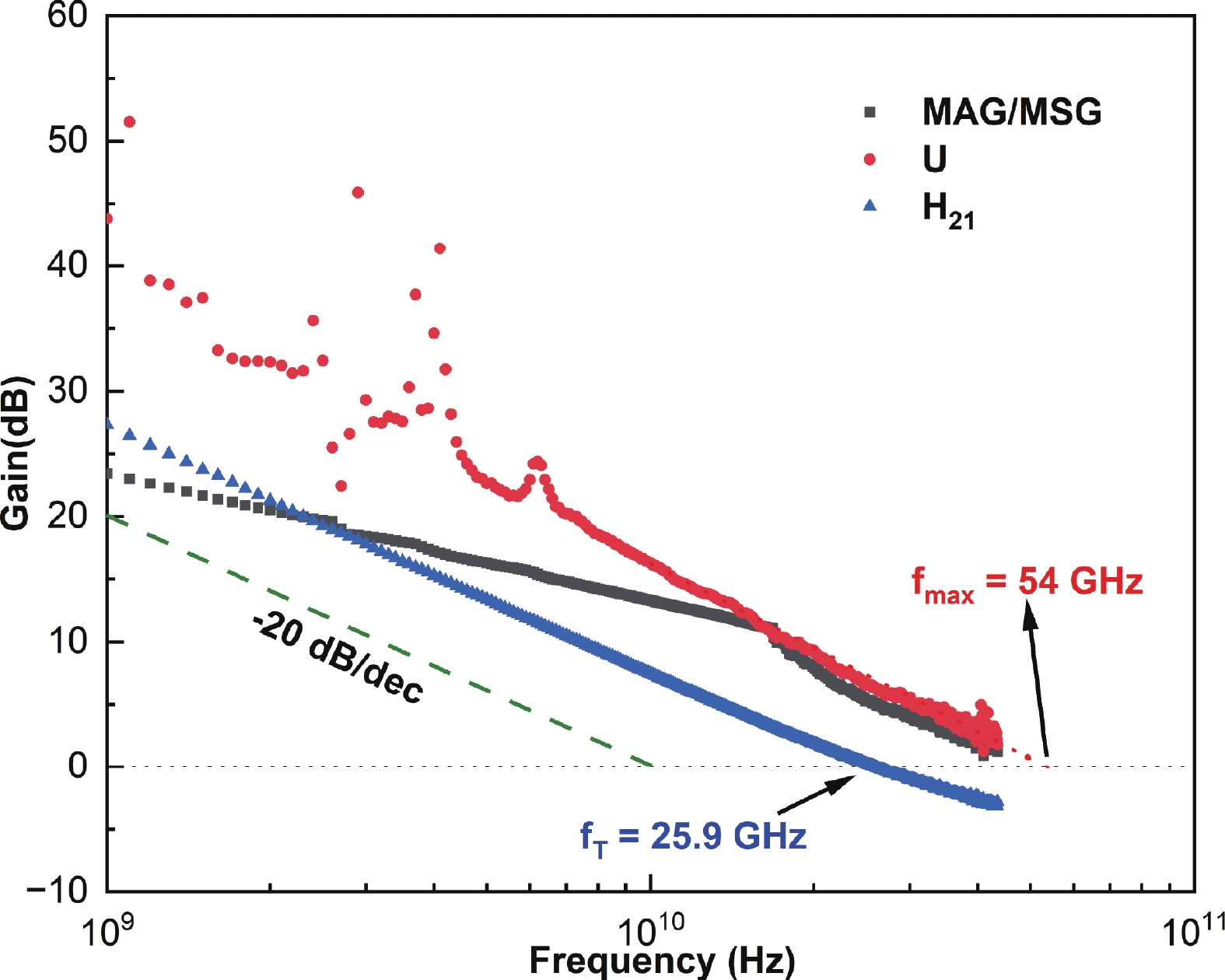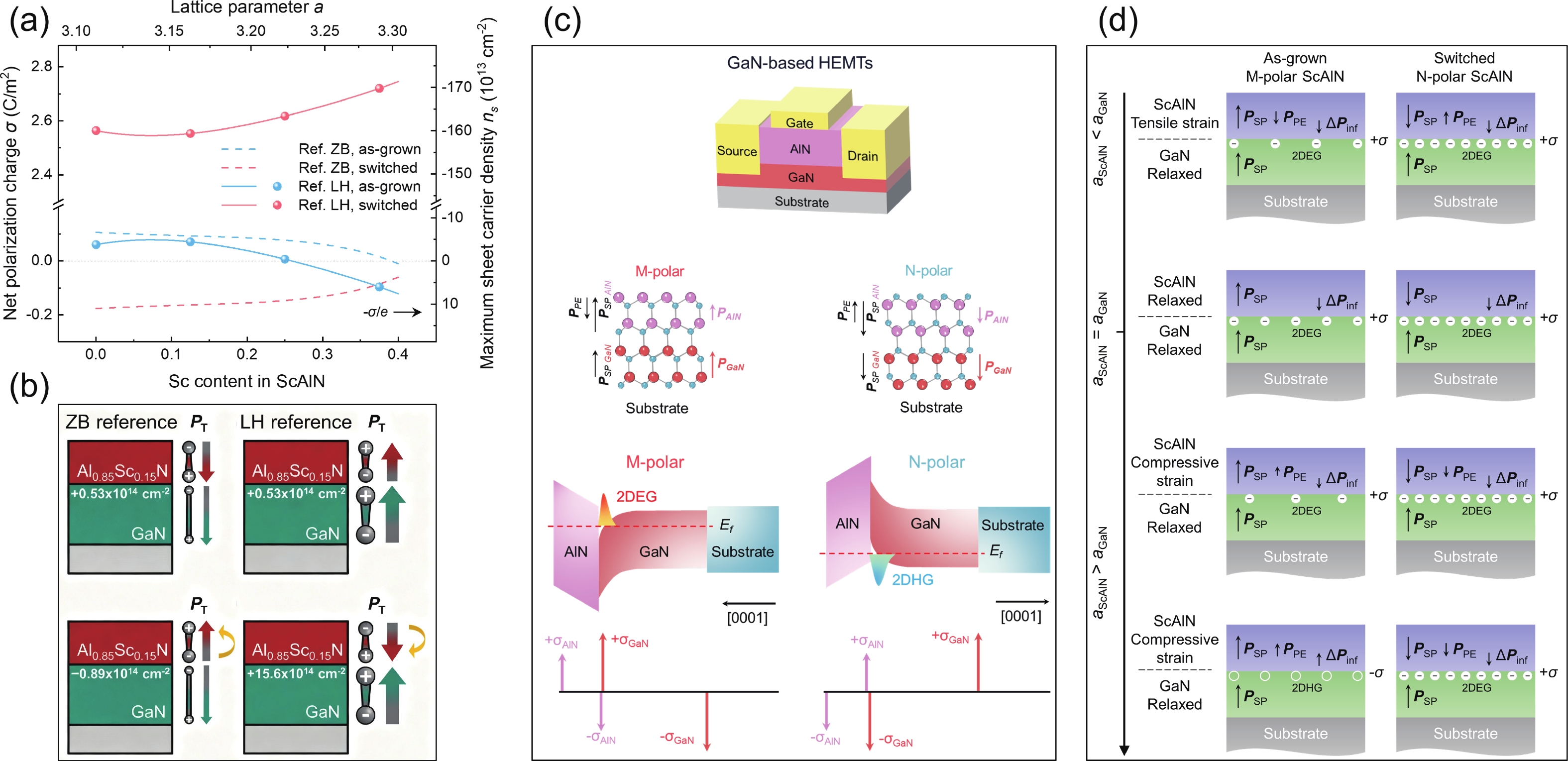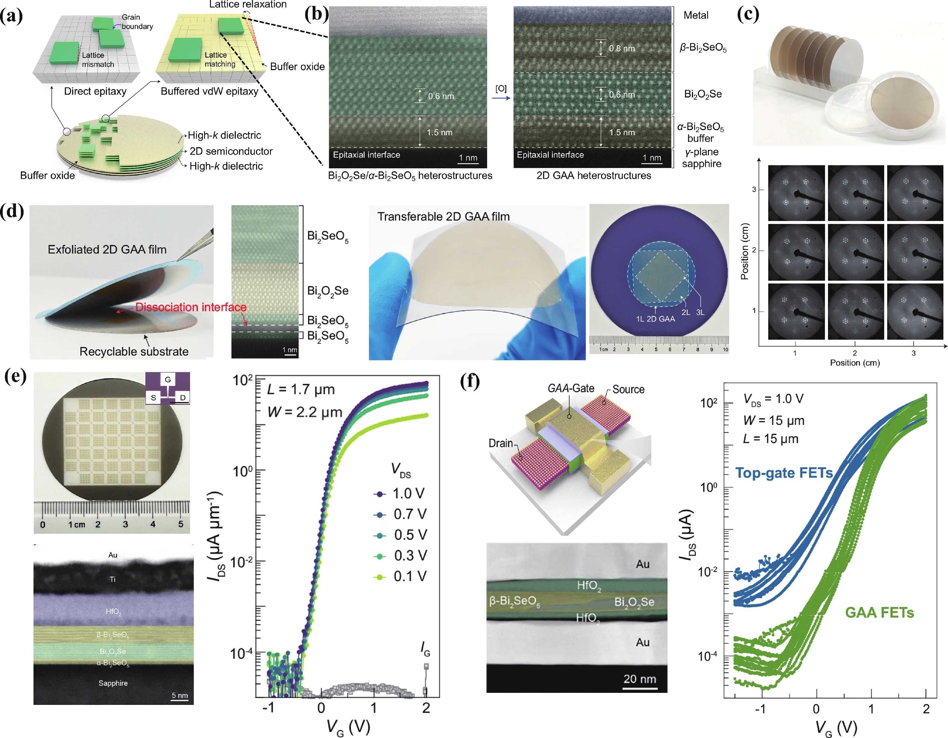 In this letter we report the morphological, electrical and thermal transport properties of a high electron mobility transistor (HEMT) style epitaxial wafer, where an approximately 2000 nm thick GaN layer has been directly deposited on a bulk single crystal AlN (BCS AlN) substrate with no buffer layer in between, and also the experimental results of DC and RF properties of a HEMT device based on such a wafer. The sample achieved very smooth surface morphology and roughness down to Ra = 0.172 nm over an area of 1 μm × 1 μm in AFM measurements. Electrical transport measurements showed sheet carrier concentration of 7.3 × 1012 cm−2, Hall mobility of 2220 cm2/(V·s) and sheet resistance of 386 Ω/sq. The measured maximum trans-conductance Gm of the fabricated HEMT device was 250 mS/mm at a gate bias voltage of −1.8 V. With a gate length of 500 nm and a gate-to-drain distance of 4.7 μm, the fT and fmax, derived from S-parameters measurements, are 25.9 and 54 GHz, respectively. Large-signal RF measurement exhibited a high linear power gain (Gp) of 25.2 dB and a peak output power (Pout) density of 7.2 W/mm@1.5 GHz, associated with a power-added efficiency (PAE) of 40.9%. Comparing with the structure with a 500 nm thick AlGaN buffer, the total thermal resistance of the structure in our device decreased by 44%. This work confirms the technical feasibility of fabricating GaN HEMT devices on BCS AlN substrates without any additional buffer layer, and the excellent electric and thermal transport properties of the simplified wafer structure indicate a bright future of BCS AlN-based GaN HEMT devices in ultra-high-frequency and high-power-density nitride electronics.