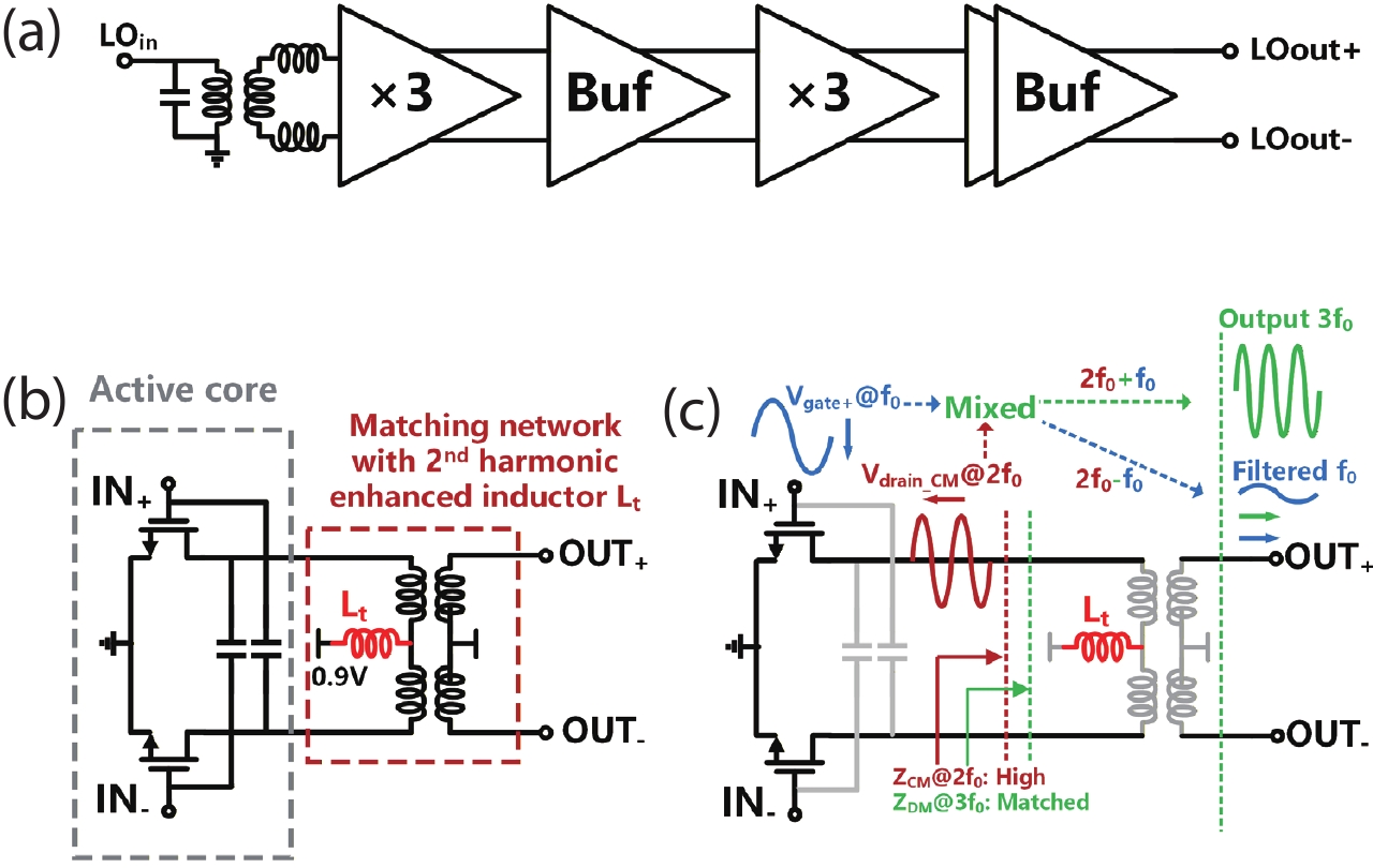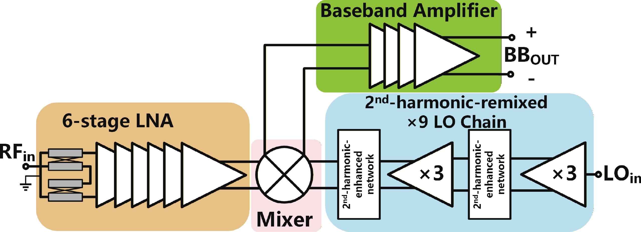In this paper, a compact and low-power sub-THz direct-conversion receiver with a second-harmonic-remixed LO chain is proposed. Based on a common-mode second-harmonic-enhanced network, the common-mode second-harmonic voltage at the drains of the common-source differential pair in the tripler is enhanced and mixed with the fundamental voltage at the gate to generate additional differential third-harmonic voltage. Hence, the saturation output power and efficiency of the triplers used in the LO chain have been significantly improved. The power consumption of the LO chain employed in the receiver is as low as 65 mW. Measurement results demonstrate that the receiver achieves a conversion gain of 30.5 dB and a 3-dB RF bandwidth of 34 GHz, while the in-band minimum noise figure is 9.9 dB.