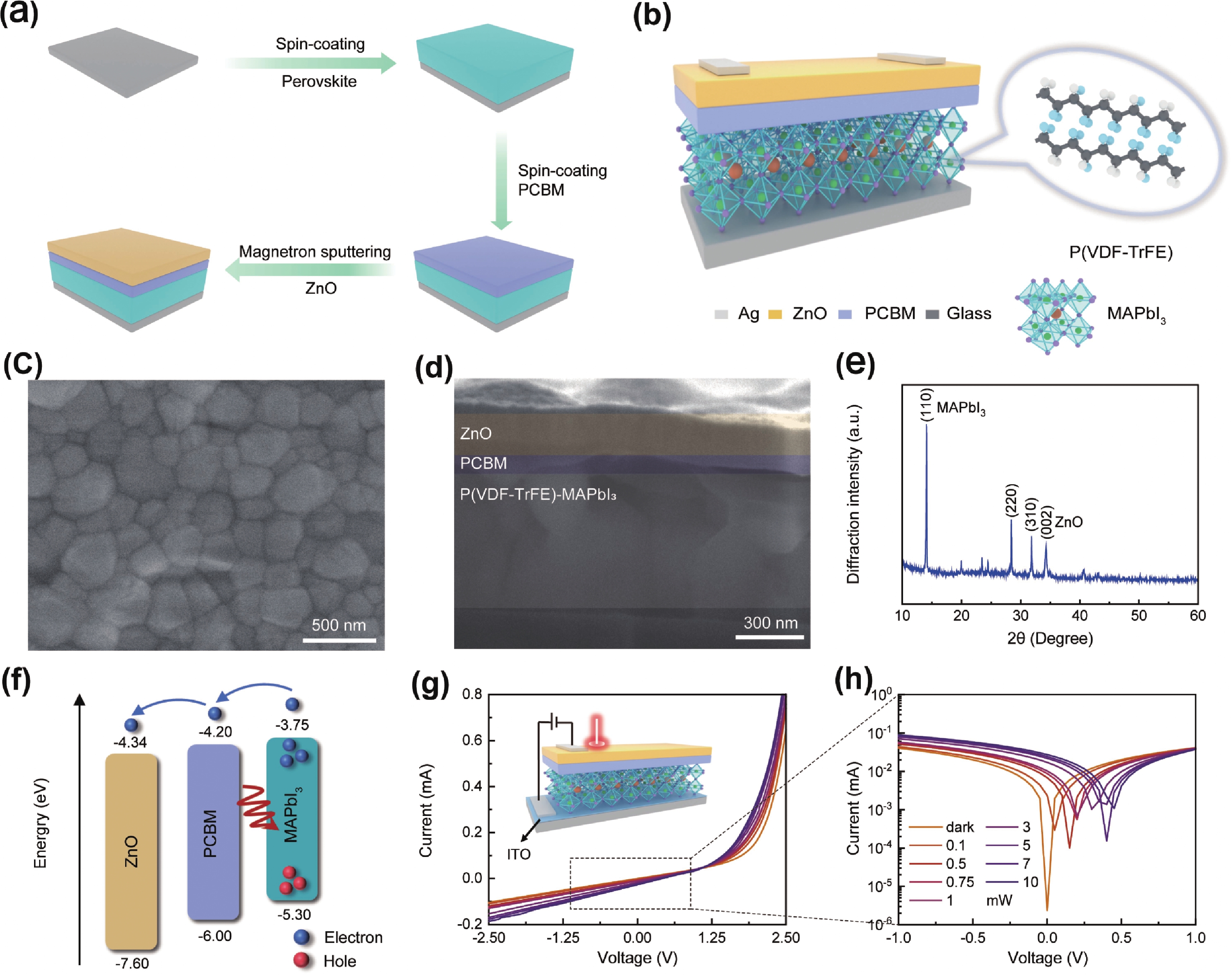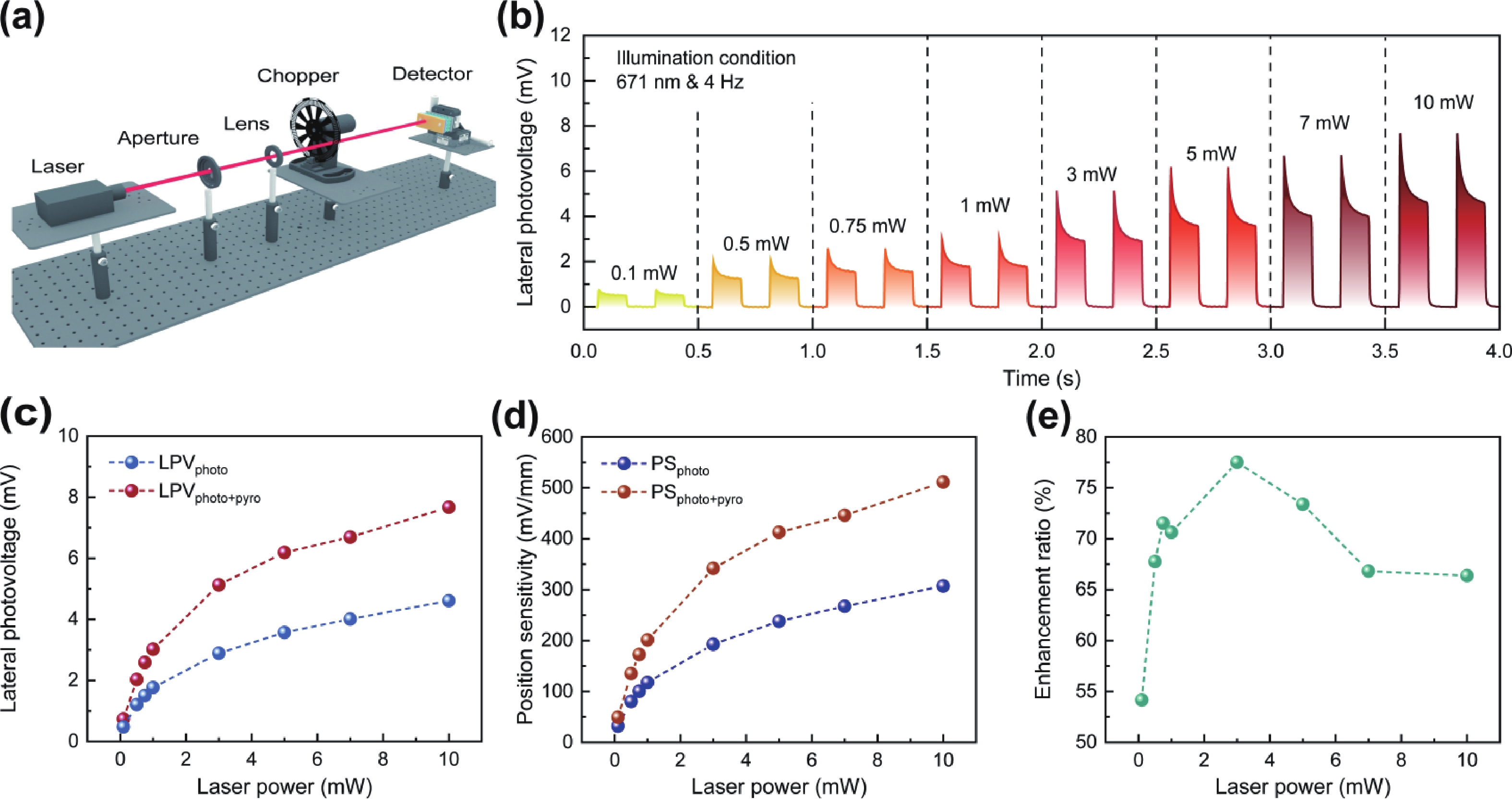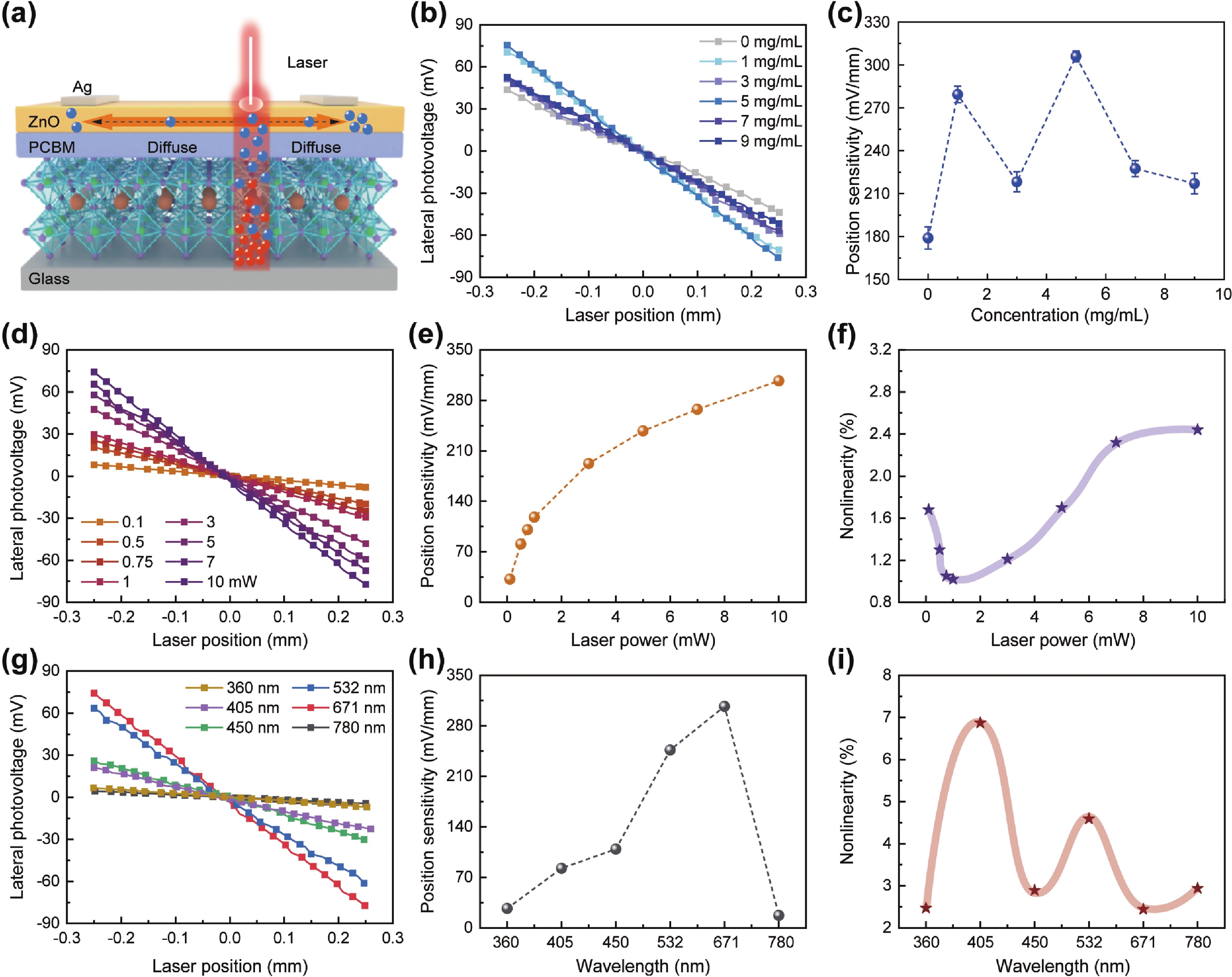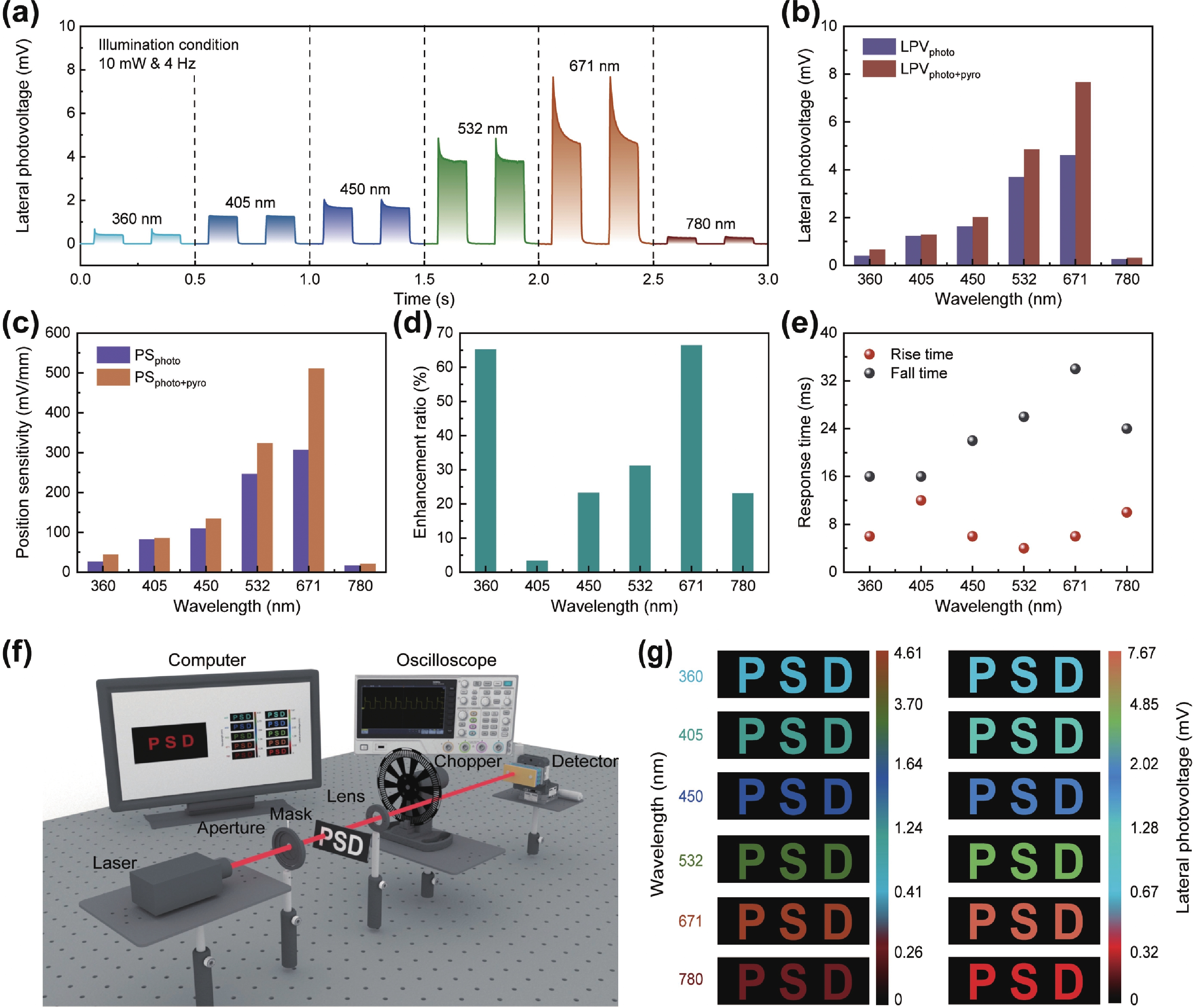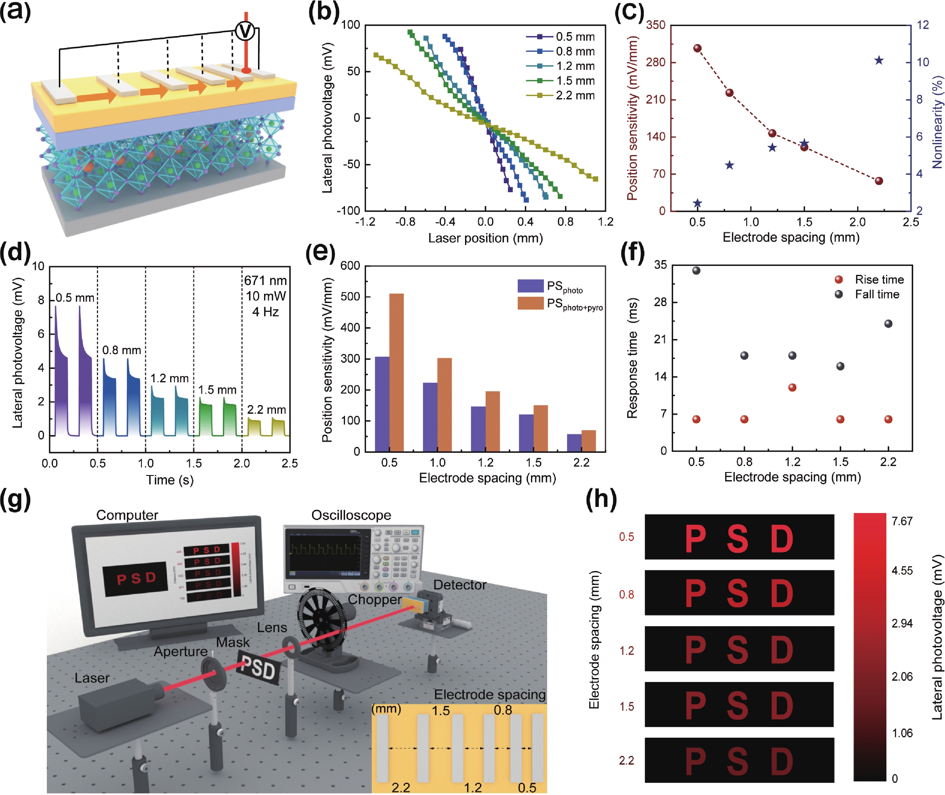 In recent years, position-sensitive detectors (PSDs) have found widespread application in displacement measurement, optical measurement, imaging, and laser communication, owing to their high spatial resolution and rapid response capabilities. However, the performance and operating mechanisms of perovskite-based PSDs remain insufficiently elucidated. In this work, we fabricated a high-sensitivity self-powered PSD based on a ZnO/P(VDF-TrFE)−CH3NH3PbI3(MAPbI3) heterojunction. Systematic optimization revealed an optimal P(VDF-TrFE) doping concentration of 5 mg/mL, enabling the device to achieve a remarkable positional sensitivity (PS) of 307.03 mV/mm with a minimum nonlinearity of 1.02%. Furthermore, the intrinsic pyroelectric property of P(VDF-TrFE) induces a significant pyroelectrically enhanced lateral photovoltaic effect (LPE), boosting the PS to 511.33 mV/mm—an enhancement of 166.5%. The heterojunction PSD maintains effective operational performance over an electrode spacing range of 0.5−2.2 mm. While the LPE response declines with increasing spacing, a considerable pyroelectric effect (PE)-enhanced PS of 70.67 mV/mm is retained even at 2.2 mm. Importantly, we demonstrate multi-wavelength imaging by exploiting both the inherent LPE response and its pyroelectrically enhanced counterpart, with imaging intensity tunable via electrode spacing control. This study provides crucial insights into the LPE behavior of the heterojunction and systematically clarifies the mechanism by which the PE modulates device performance and imaging capabilities.