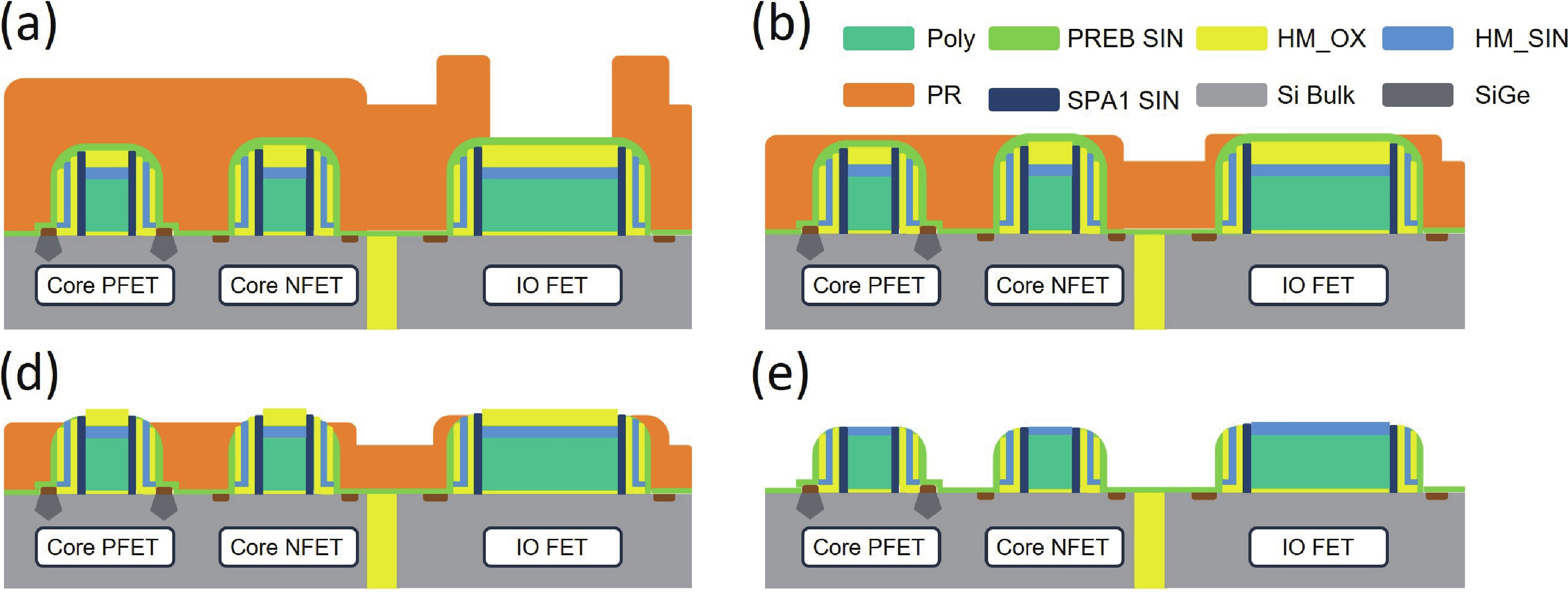 The introduction of high-k/metal gate (HK/MG) technology enables independent tuning of N-type metal−oxide−semiconductor (NMOS) and P-type metal−oxide−semiconductor (PMOS) threshold voltages, facilitating advanced nodes and improving overall chip performance. However, severe pattern loading effects during PMOS device fabrication pose challenges in dummy poly removal. This work reports the optimization of the Photoresist Etch Back (PREB) process, providing a wider process window for subsequent AL CMP. By tuning the PR coating uniformity to 1.6% and applying four-zone electrostatic chuck (ESC) temperature control, the wafer-level uniformities of PR, SiN, and SiO2 were reduced to 6.3%, 2.3%, and 5.1%, respectively. An optimized over etch (OE) recipe with a high selectivity of PR : SiN : SiO2 ≈ 1 : 1 : 6 effectively balanced gate height loading between N- and PMOS regions. Furthermore, precise EB1 time tuning enabled defect removal, while advanced KLA inspection ensured early detection of critical failure modes. Collectively, these measures establish a robust and stable PREB process for advanced logic device fabrication.
