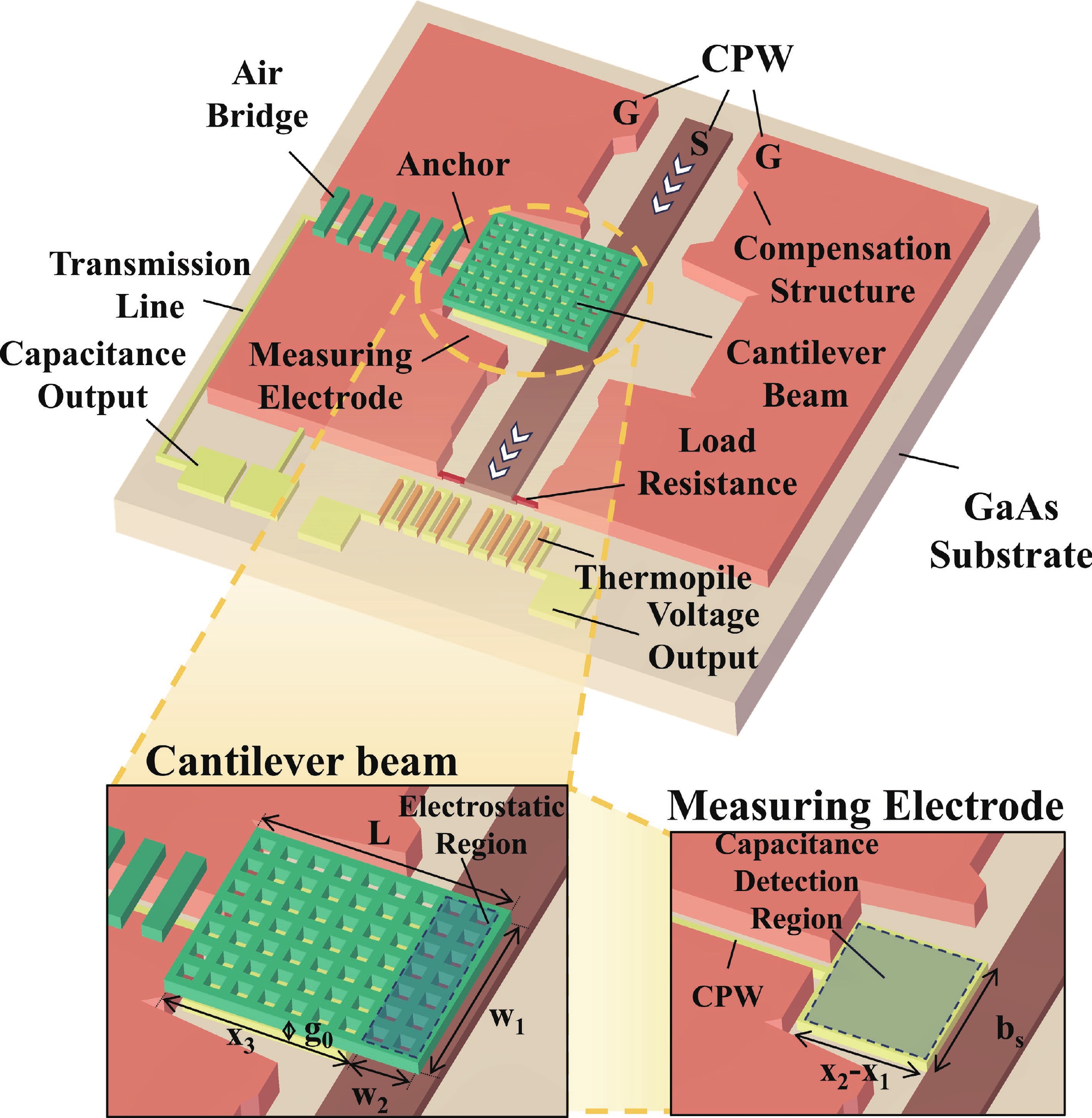 To study MEMS power detection chips more accurately, a thermo-electromechanical coupling model is proposed in this work. The fringing capacitance is included in the model, further refining the expression for the parallel-plate capacitance. Moreover, the squeeze-film damping and thermoelastic damping are considered in the second-order differential equation to study the cantilever vibration. It is found that the squeeze-film damping is the dominant damping of the system, and the cantilever beam exhibits linear expansion with increasing temperature. A dual-channel microwave detection chip is fabricated and measured, and the return loss reaches its minimum of -66.46 dB at 9 GHz, indicating optimal impedance matching at the central frequency. Moreover, the measured sensitivity is approximately 65.6 fF/W. Critically, the measured resonant frequency of the cantilever beam is 115.7 kHz, which is orders of magnitude lower than the input signal frequency. This large separation ensures that the sensor operates in a stable, non-resonant regime, thereby guaranteeing linearity and reliability. These findings demonstrate the excellent microwave performance of the power sensor fabricated in this work, providing valuable insights for optimizing the design of MEMS microwave power detection chips.